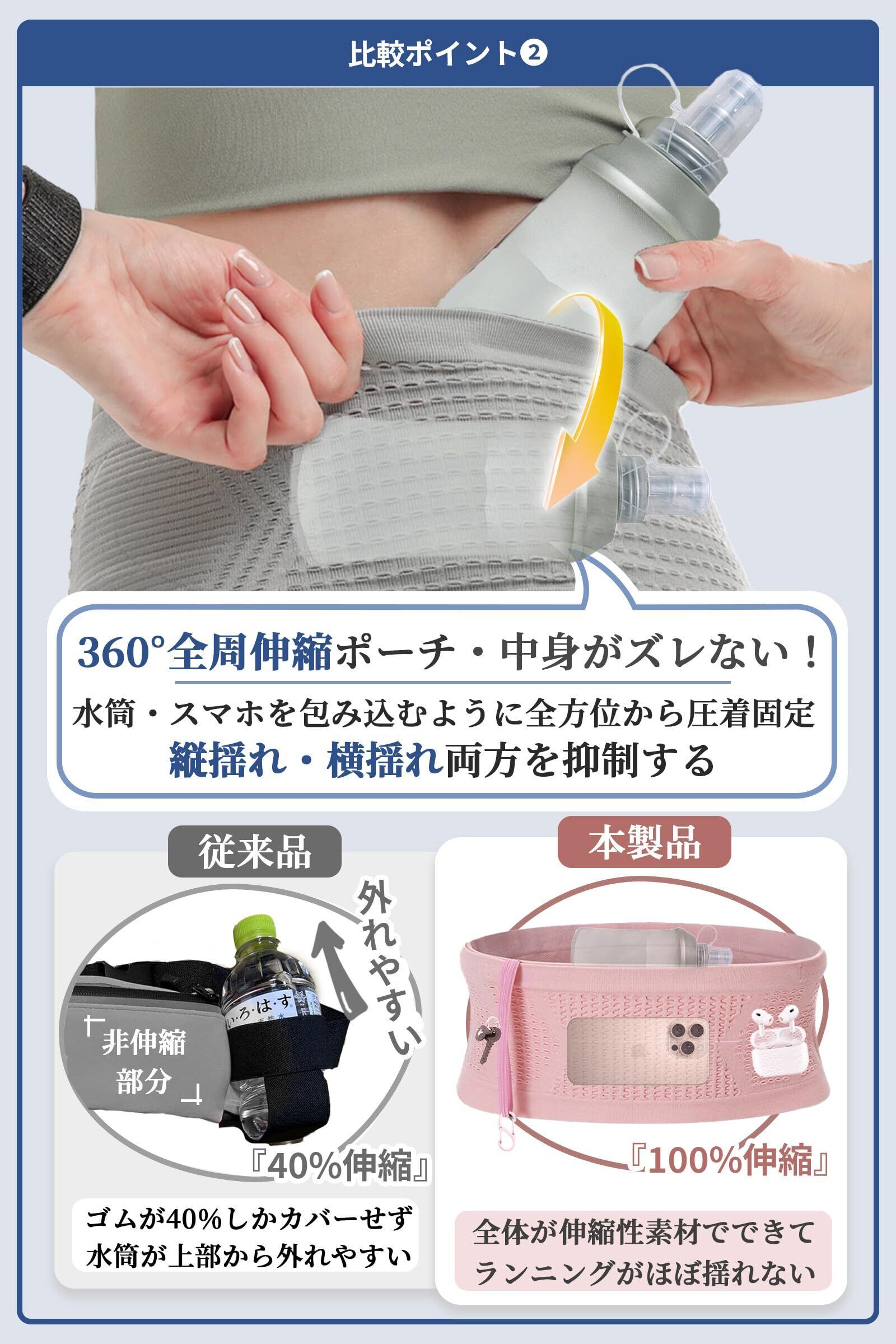 【他と違う!360度フィット】従来のウエストポーチと異なり、全体が伸縮性素材でできて、ランニングがほぼ揺れない!さらに新設計の「点線仕切り」を内側に採用し、スマホ・鍵・水筒などがポーチに動き回るのを防止