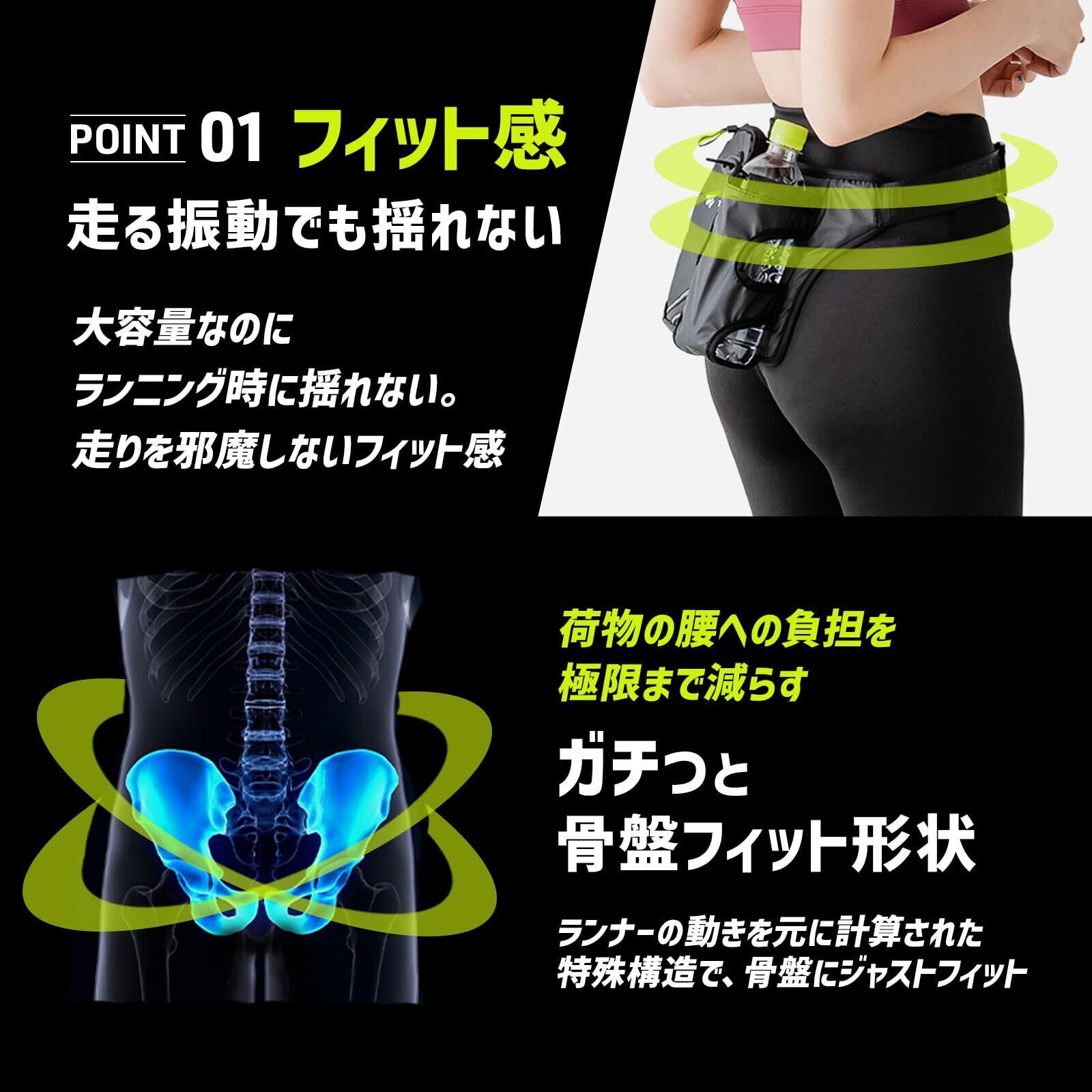 揺れに強いフィット設計で快適ランニング 腰にしっかりフィットする立体設計で、激しい動きでもズレにくく、ジョギングやランニング時もストレスフリー。ウエストサイズ52〜120cm対応で男女兼用。