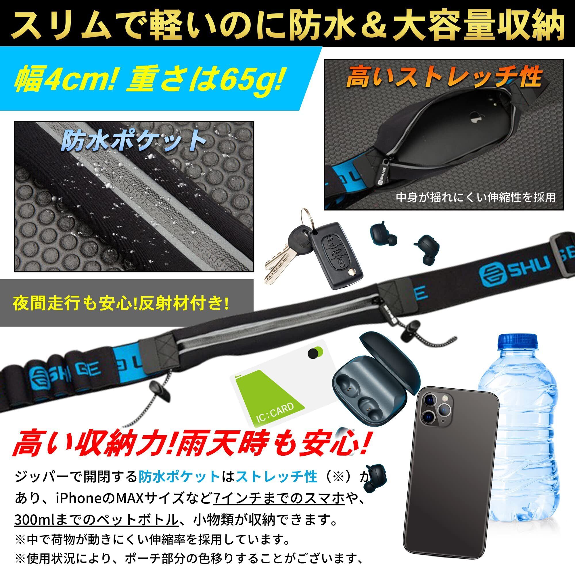 【揺れにくさ】伸縮性の高い高耐久ゴムベルトを使用。ジッパーからも水が入りにくい防水ポケットは中身が揺れにくい適度なストレッチ性で身体にフィットし、7インチまでの大型スマートフォンや300mlまでのペットボトルなどを入れても快適な走行を実現。