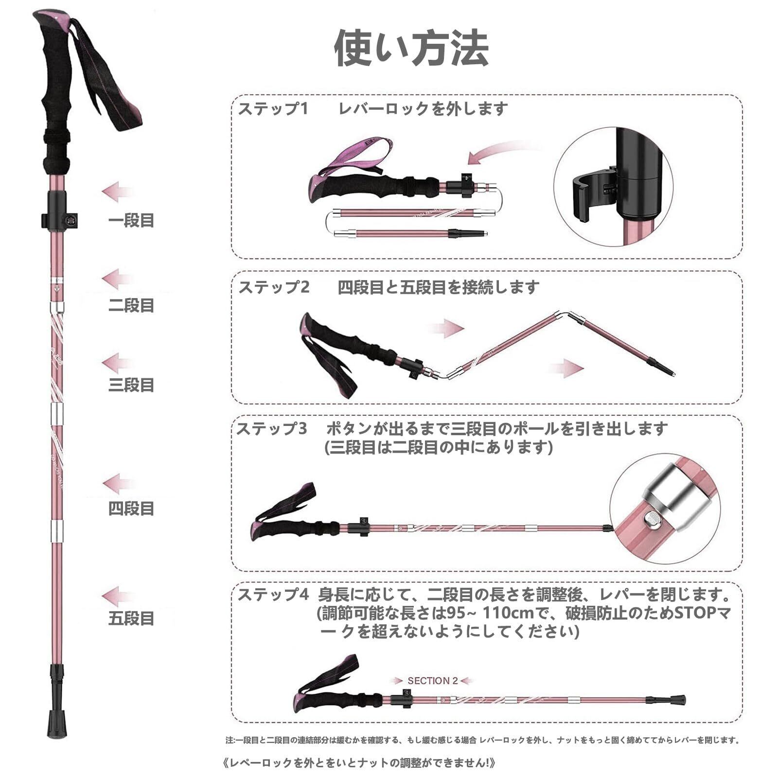 【5段伸縮式・長さ調節可能】ストックの連結部はレバー式ロックを使用、適した長さに簡単に調整できます。ポールの高さを95㎝から115㎝まで調整でき、自分に合った長さを調節できます。折り畳み時は約30㎝になるので、コンパクトに持ち運びが便利です。