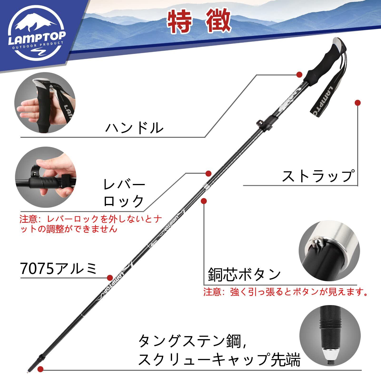 【丈夫で安定感抜群】 LAMPTOPのトレッキングポールは、航空機材A7075素材(超々ジュラルミン)で作られていて、軽量しながら強度も高い。 長さしっかりと固定できるレバーロック仕組みを採用、ポールの長さを一秒に調節でき、地形の変化に素早く対応できます。