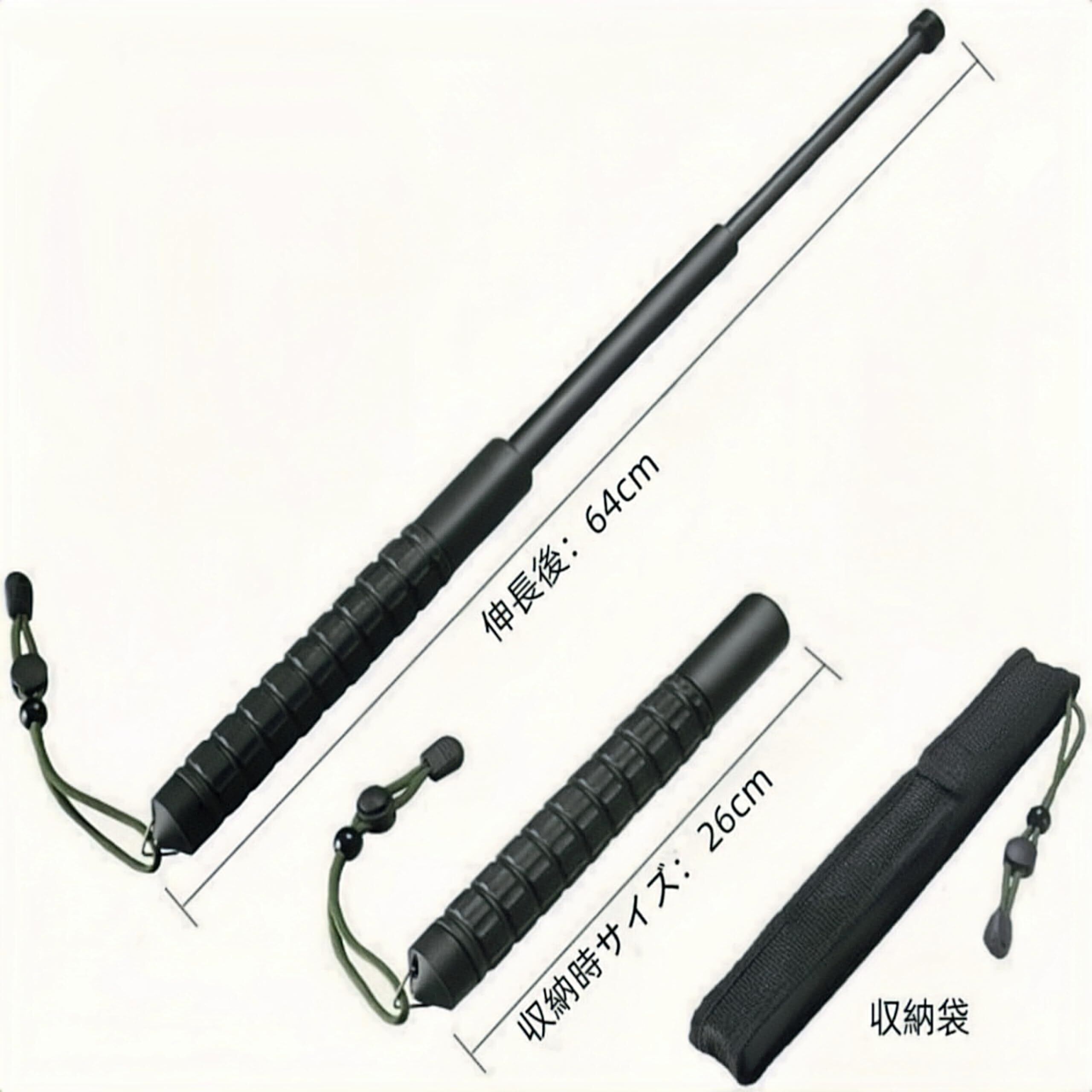 3 段伸縮式設計:保護具は伸縮式で、伸ばした時の最大長さは 64 センチメートル、縮めた時は 26 センチメートル以内です。折りたたんだ状態はコンパクトで、ポケット、カバンまたは車内に入れて持ち運ぶのに便利です。