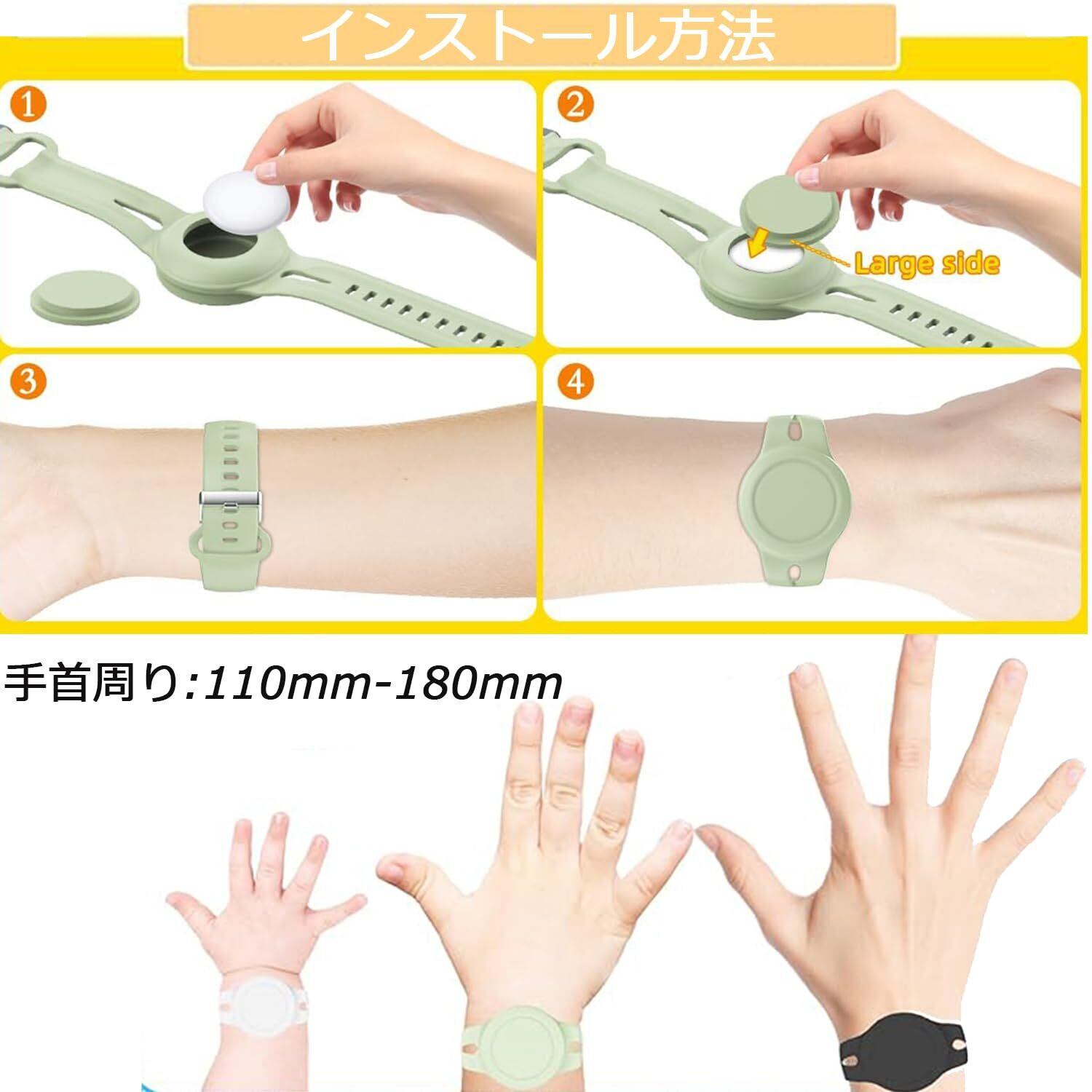 サイズ調整可能:調節可能なAir Tag互換リストバンドは特殊なデザインのバックルを採用し、Air Tagを手首にしっかり固定することができるので、リストバンドが外れる心配はありません。お客様の家庭、特に子供や幼児に適しています。110mm-180mmの手首周りに適用しています。