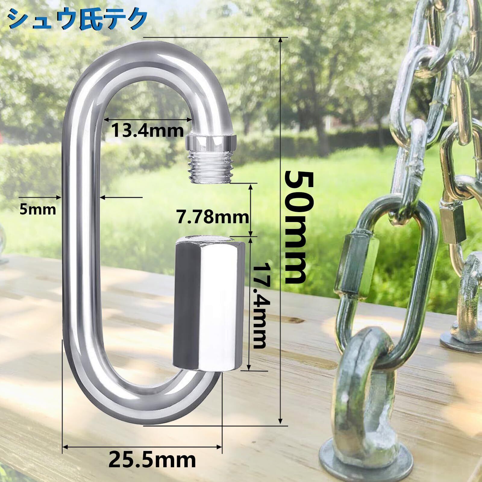 【クイックリンク口素材】:SUS304 (クロム18%ニッケル8%)。防錆性・耐候性に優れ丈夫で長持ち。屋外での使用や海に近い地域できる。