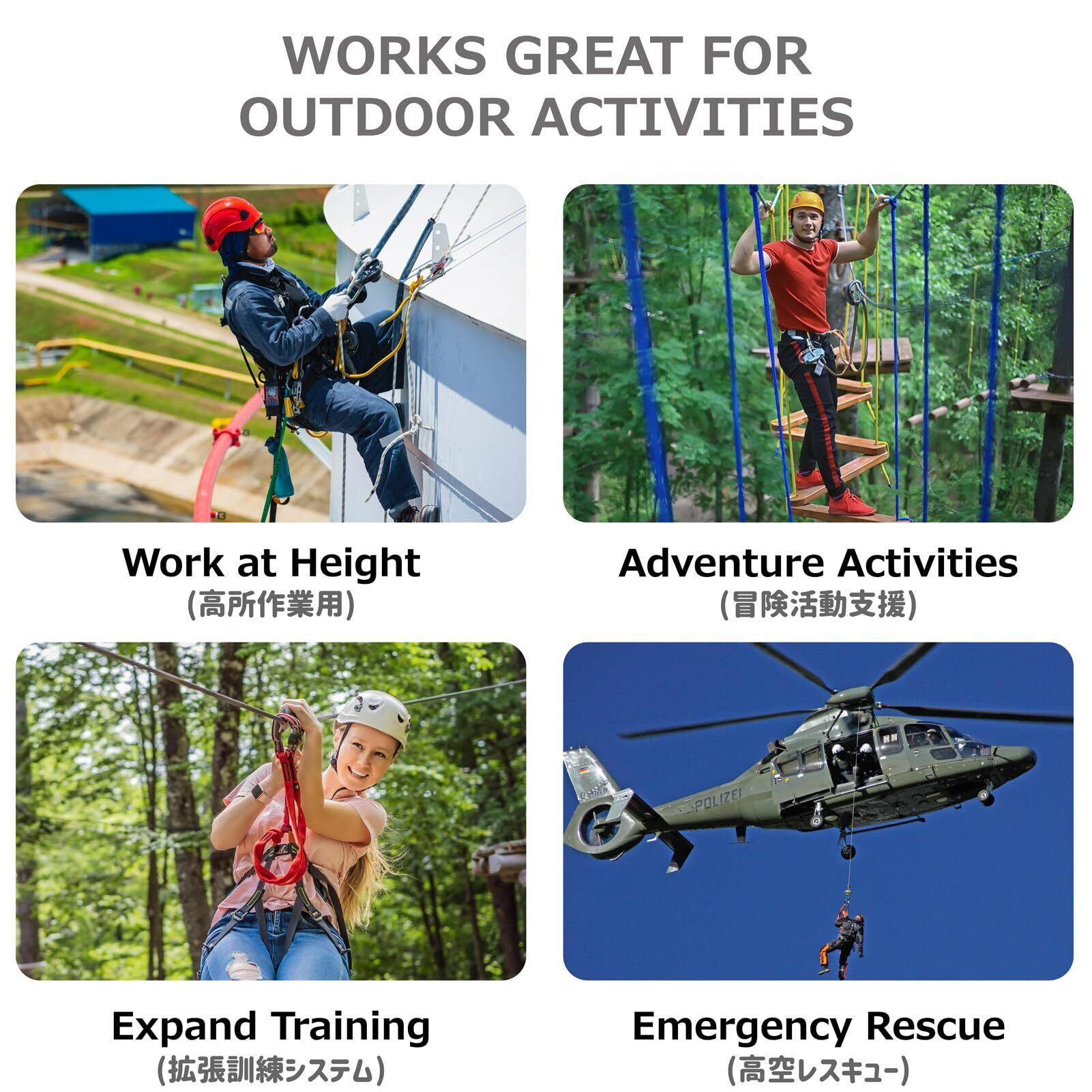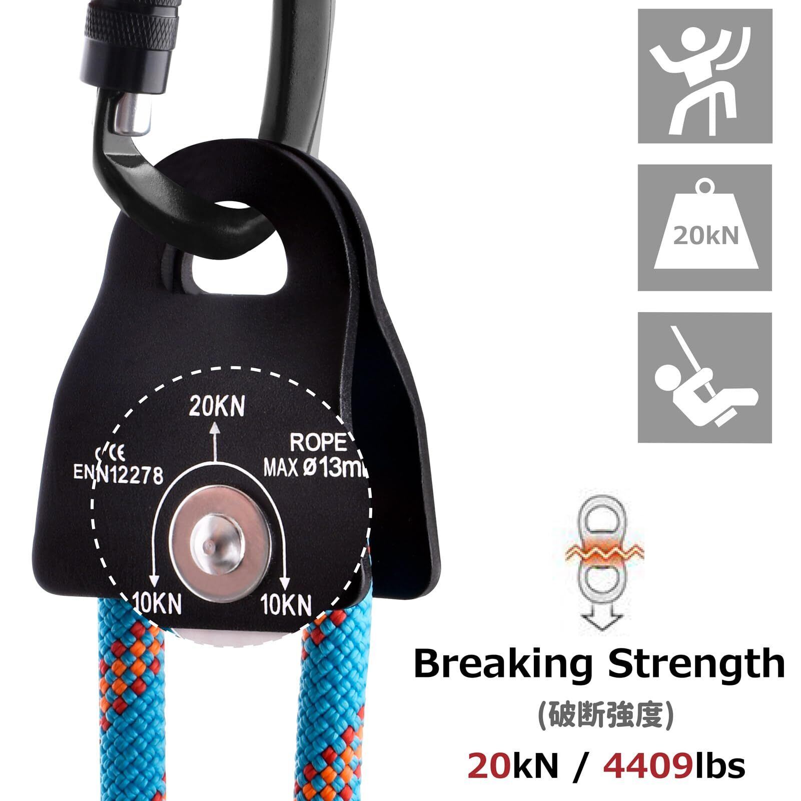 【強度】破断強度: 20kN、適用可能なロープ直径は 8〜13mmで、ロッククライミングで人や物を持ち上げる時に省力することができます様々な使用場面に応じます