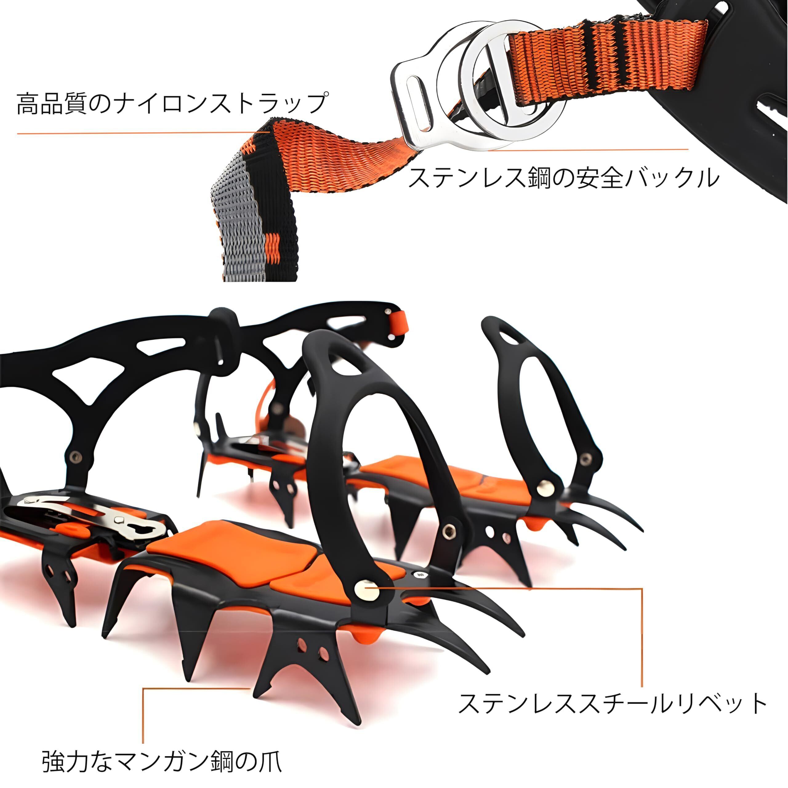 【12個の歯】この靴は12個の歯を氷の爪で覆い、雪の中での落下や登山などを防ぎます。クランポンの12個の爪は鋼板から切り取られています。丈夫で安全。また、釘の一本一本が加熱され強度が高く折れにくい。さまざまな滑らかな表面で優れたトラクションを提供します。