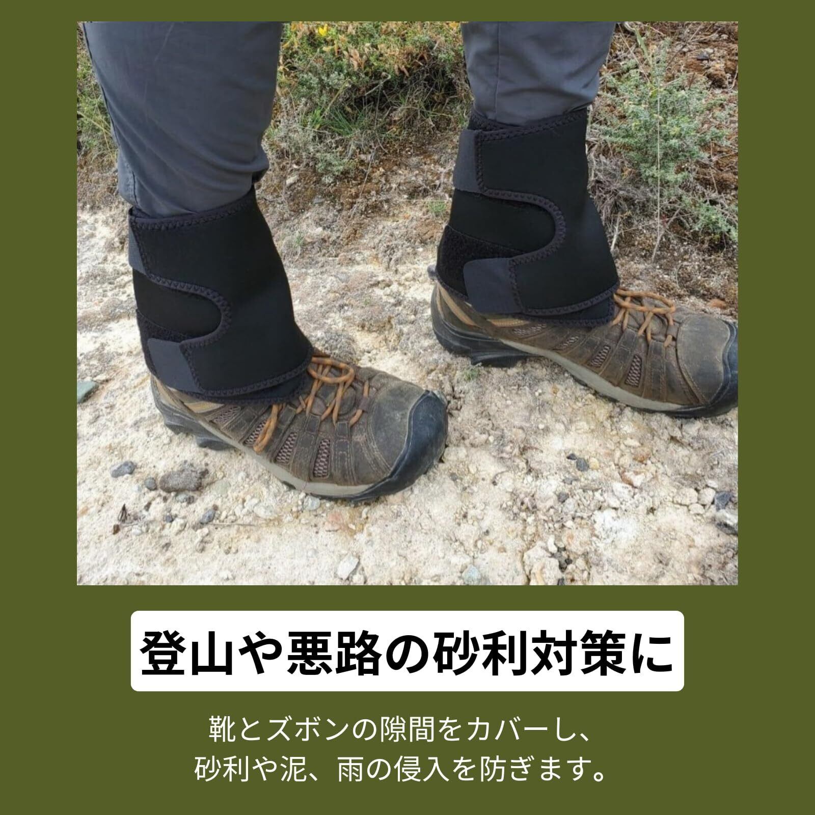 【登山や悪路の砂利対策に】登山やハイキング、トレイルウォーキングなど、アウトドアシーンで活躍するレッグカバーです。靴とズボンの隙間をカバーし、砂利や泥、雨の侵入を防ぎます。