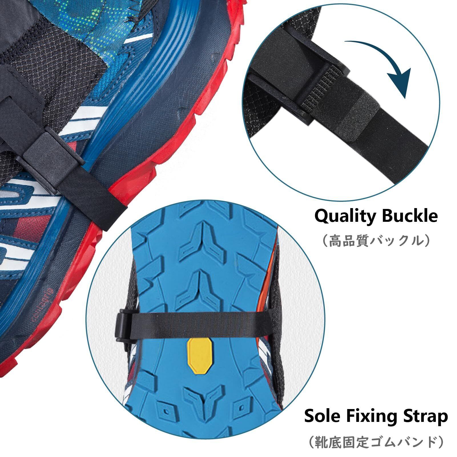 【しっかりと固定】前部の靴紐フックと後部のゴムストラップが、登山ゲイターのズレ落ちを防止。足底のハイパロンゴムストラップをの密着性をさらに向上します