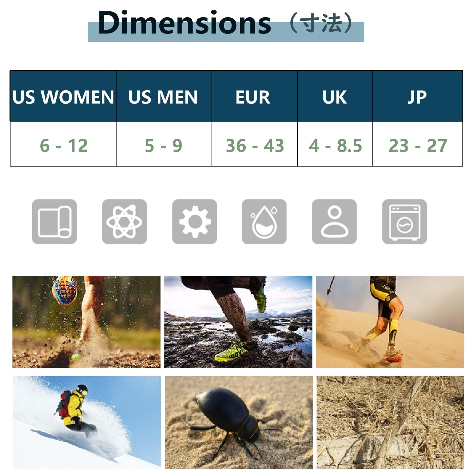 【サイズ調整可能】下部は19cmの長さがあり、上部には開口式ドローコードデザインを採用しているため、様々な脚のサイズに適応できます。これらのデザインによって、砂や小石、虫が入り込むのを効果的に防ぎます