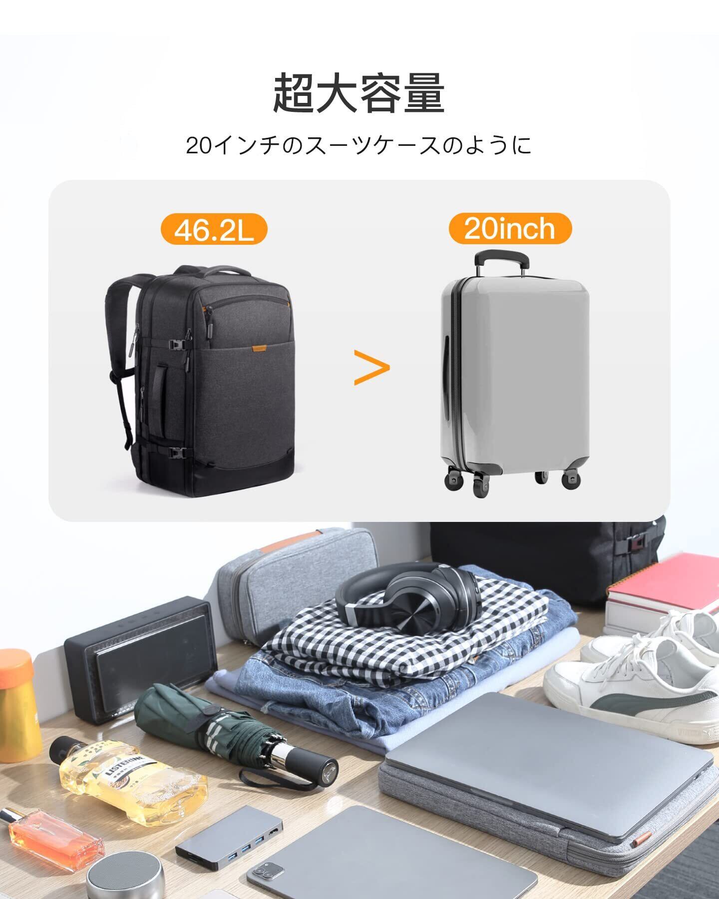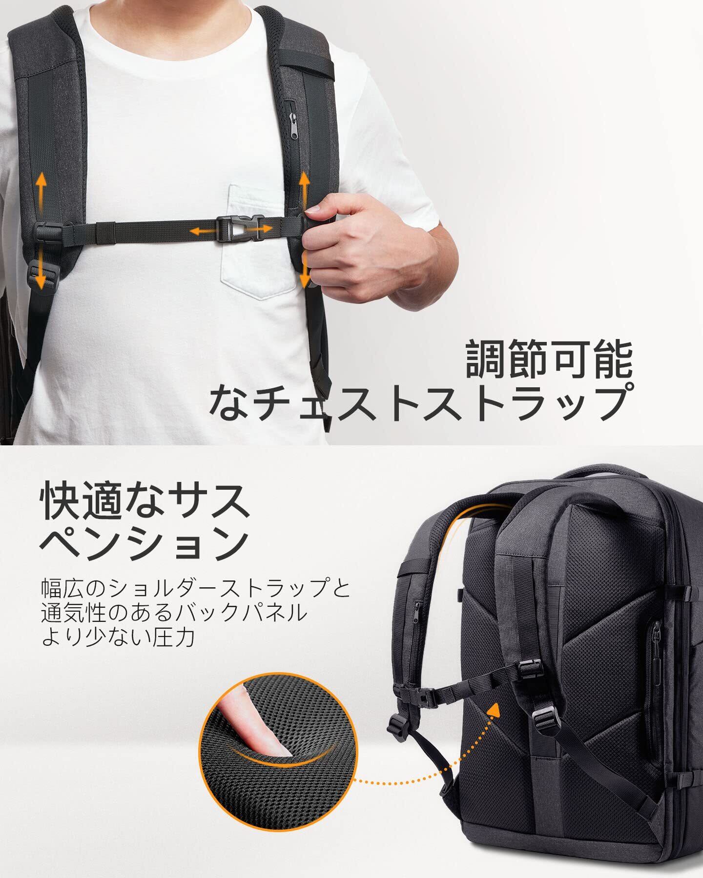 Inateck 38.5-46.2Lトラベルバックパック 拡張可能 機内持ち込み手荷物 ハンドラゲッジ トロリーストラップ付き 最大17.3インチラップトップ収納可能 盗難防止 撥水加工 耐衝撃 通勤 出張 通学 男女兼用