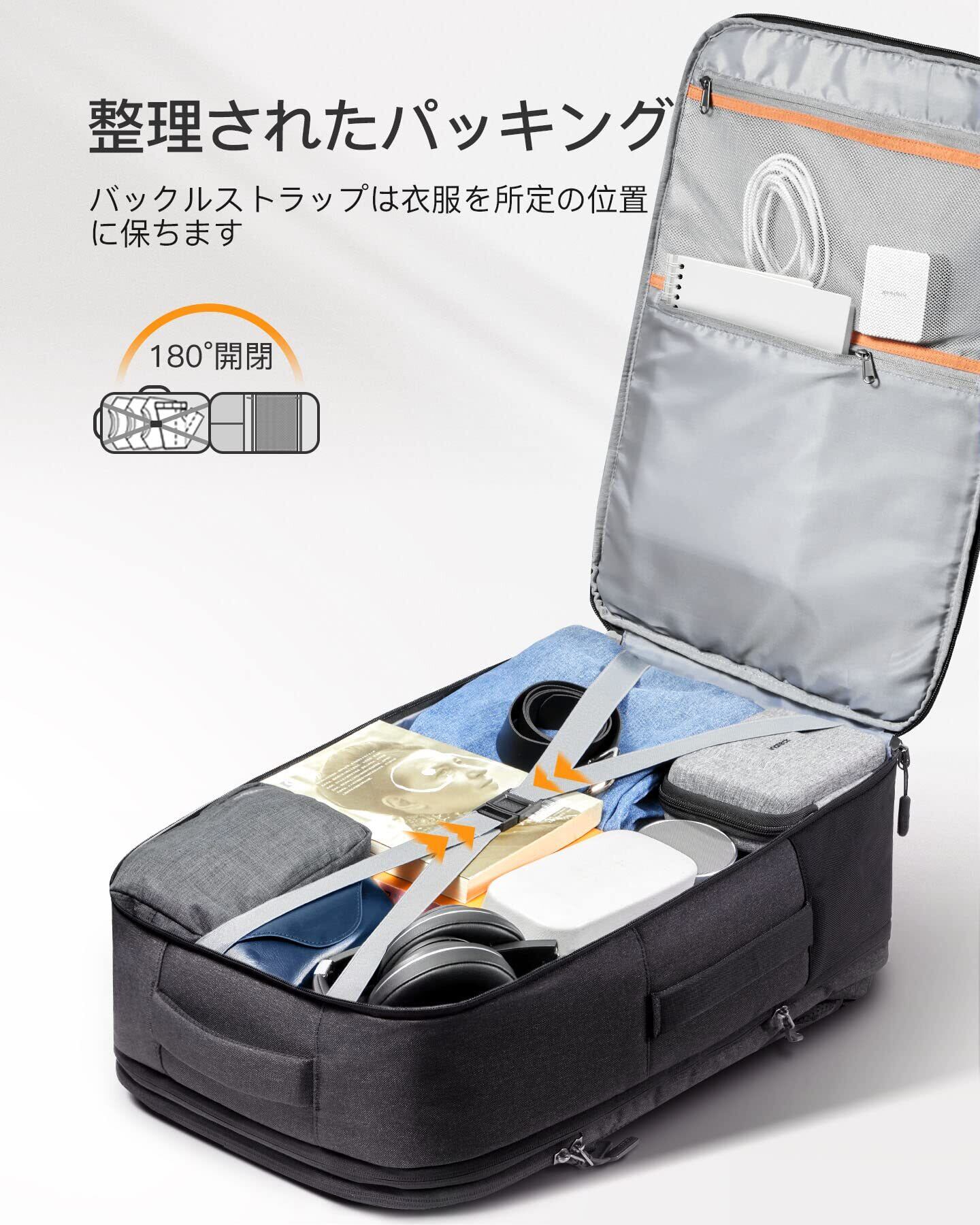 大容量メイン室:大容量メイン室は22Lスーツケースと同じぐらいの容量で、2泊3日分の荷物を問題なく入れます。荷物室はスーツケースのように180°開くことができるので、荷物の整理整頓がやすくなります。さらに内部にバックルストラップが備え付けられているため、荷物をしっかりと固定できます.