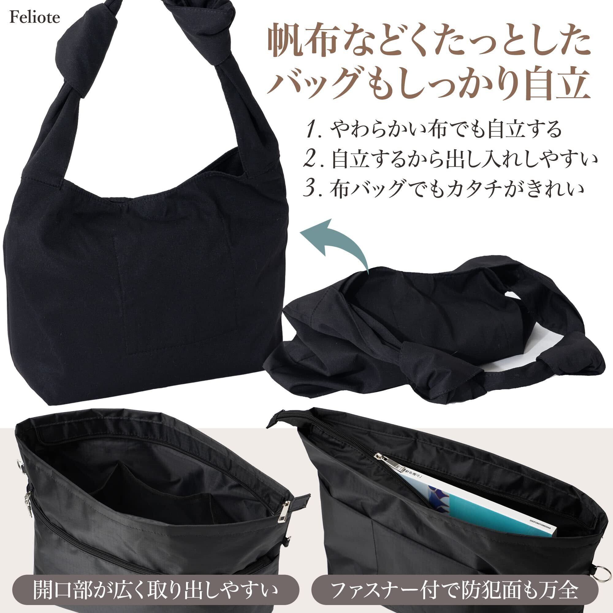 【自立型で折りたたみもできる】 バッグから取り出しても、くたっとなりにくい自立型なので、バッグの型崩れ防止にもなるだけでなく、すでに型崩れをしてしまっているバッグの中に入れればバッグの補正にもなる優れもの。柔らかいバッグを自立させたいときにも、本体バッグの芯となりますのでとても便利です。柔軟性もあり、バッグの形に柔軟に対応するので、どんなバッグにも収まります。使わないときは小さく折りたたんで収納したり、必要のない部分を折りたたんで使用することも可能です。また、素材には防水性のあるオックスフォードクロスを使用しています。