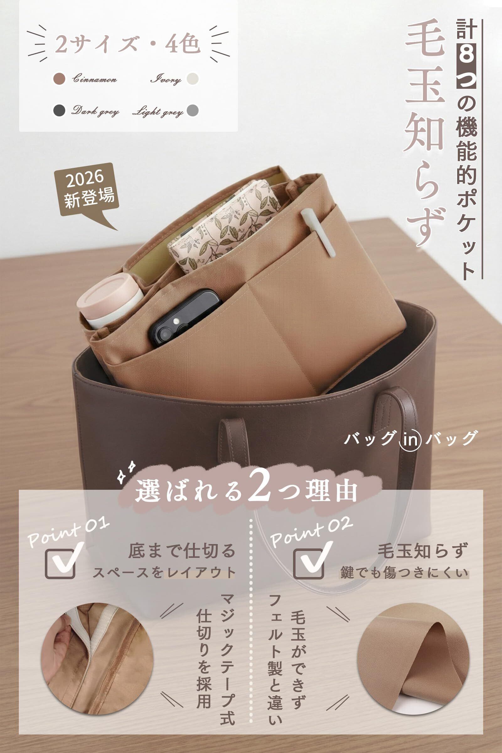 【底まで仕切る!2026新登場】 底部にマジックテープ式仕切りを採用し、底の隙間から小物が移動する悩みを解消。中身が混ざらず、トートバッグの中を完璧に整理整頓できます
