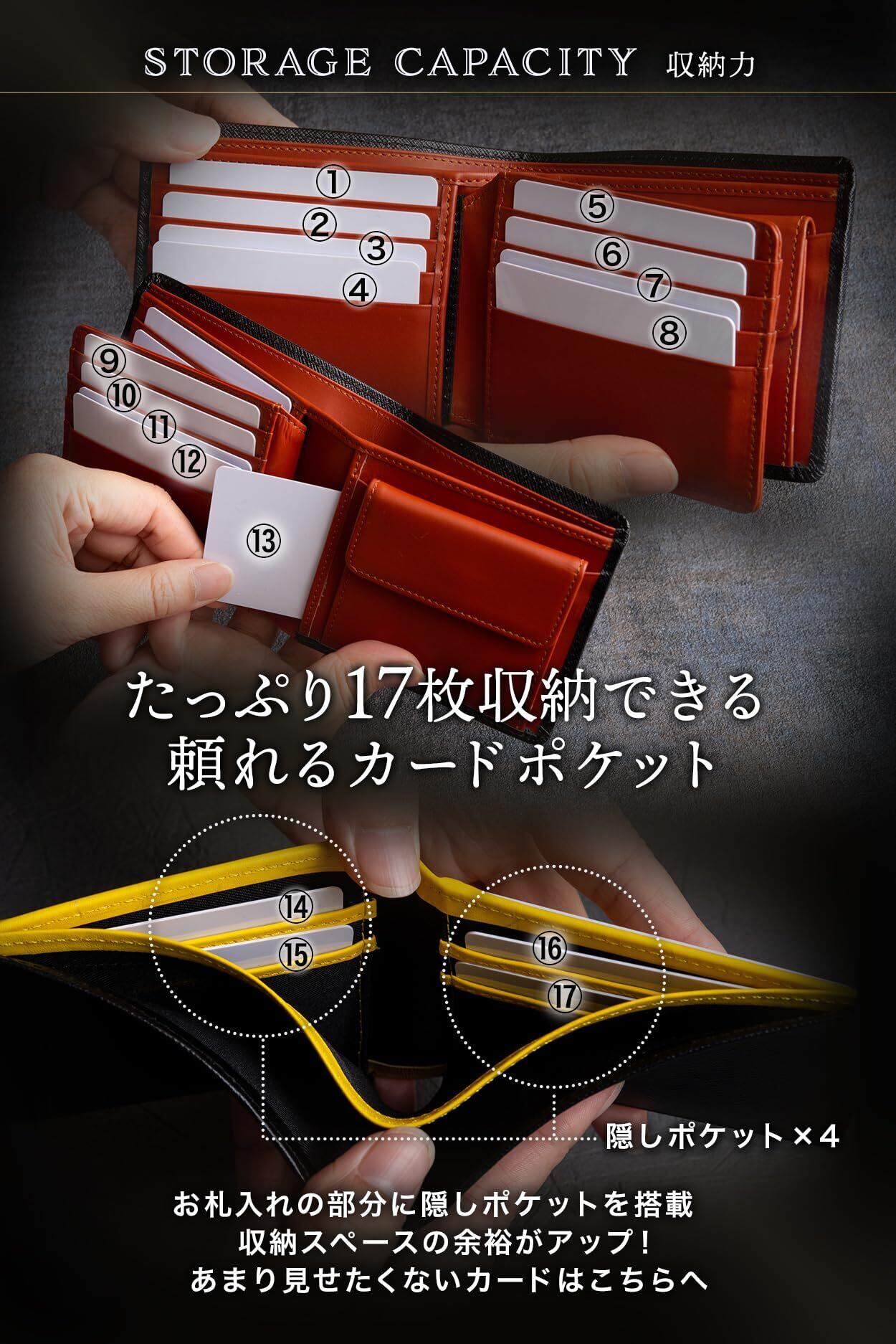【特色】カード収納が17枚。カードシートは着脱式。/【素材】外革:耐久性・撥水性が高いサフィアーノ(イタリアンレザー)/内革:高級車のシートにも使われるナッパレザー [専門機関による本革鑑定取得済み]