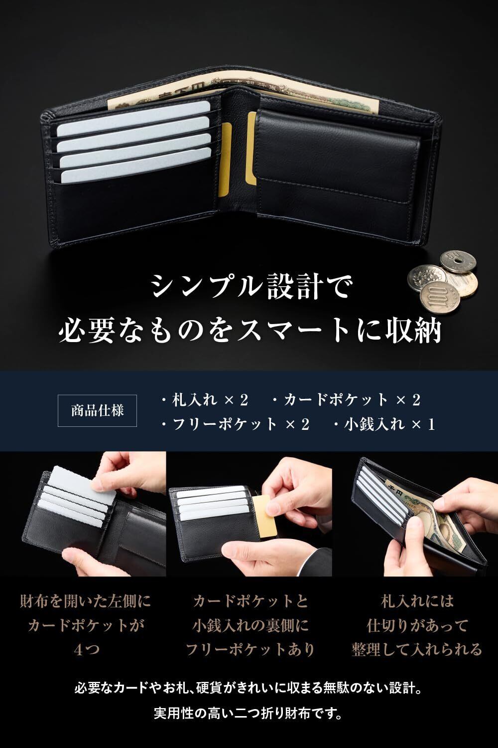 【シンプル設計で必要なものをスマートに収納】マチが大きく開いて出し入れしやすいコインポケット。一目で中身が分かり、小銭の出し入れがしやすいです。財布を開いた左側にカードポケットが4つあり、カードポケットと小銭入れの裏側にフリーポケットが1つずつあり、カードもたくさん収納可能。札入れには仕切りがあって、お札や領収書などを整理して入れられます。必要なカードやお札、硬貨がきれいに収まる無駄のない設計。実用性の高い二つ折り財布です。