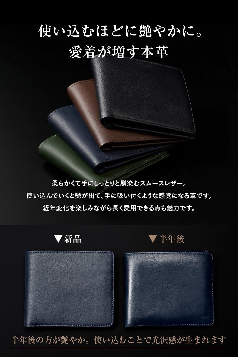 【日本製/本格派にふさわしい上質な本革財布】ジャパンレザーの代表格である“たつのレザー”使用。純国産神戸牛の原皮を使用して製作された二つ折り財布です。シンプルでオーソドックスなデザインとしっとりと手に馴染むスムースレザーが魅力。使い込むほどにツヤや光沢感が増し、手に吸い付くような感覚になります。経年変化を楽しみながら長く愛用できる点も魅力です。