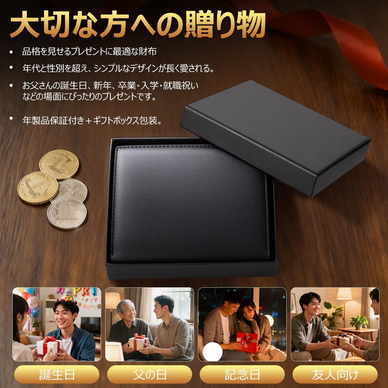 【プレゼントに最適な財布&安心の 1 年保証】この二つ折り財布はギフトBOX同梱で、そのまま贈り物にできます。社会人デビューの后辈や父の日のお父さんなど、どんな祝日にもぴったりです。本革の高級感と実用性を備え、購入後 1 年間のアフターサービスも付属し、万が一の不具合が生じた場合、速やかに対応をさせていただくため、贈る側も受け取る側も安心して使用できる。贈られた人が長く愛用できる、体面と実用性、さらに安心感まで兼ね備えたメンズ二つ折り財布です。
