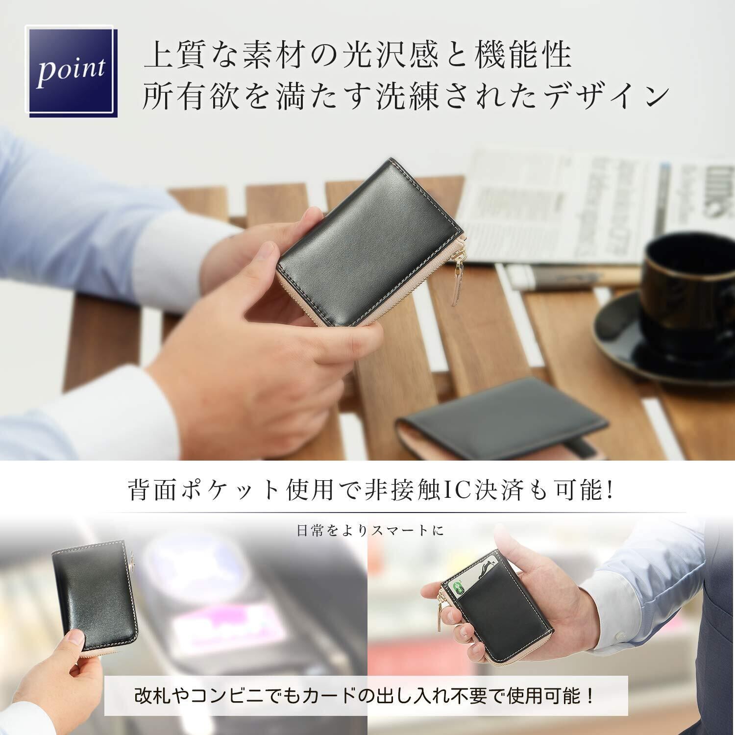 【サイズ・素材・仕様】 サイズ:縦 約66mm × 横 約98mm × 厚さ 約18mm ※お札は三つ折りでの収納となります。 素材:牛床革 仕様: ・コインスペース×1 ・フリースペース×1 ・カードポケット×2 ・背面カードポケット×1