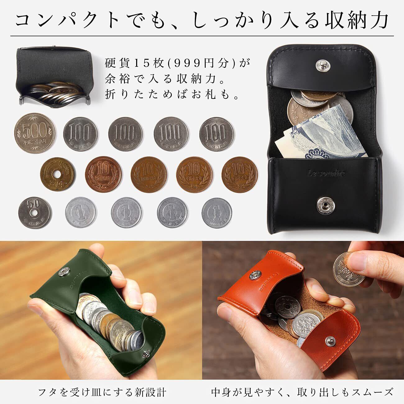 【中身が見やすく、取り出しやすい新設計のコインケース】 コンパクトな見た目でも、500円玉1枚、100円玉4枚、50円玉1枚、10円玉4枚、5円玉1枚、1円玉4枚、合計15枚(999円分)が余裕で入る収納力。「蓋を受け皿」にすることで、中身を見やすく取り出しやすい、スマートな会計をサポートするコインケースです。
