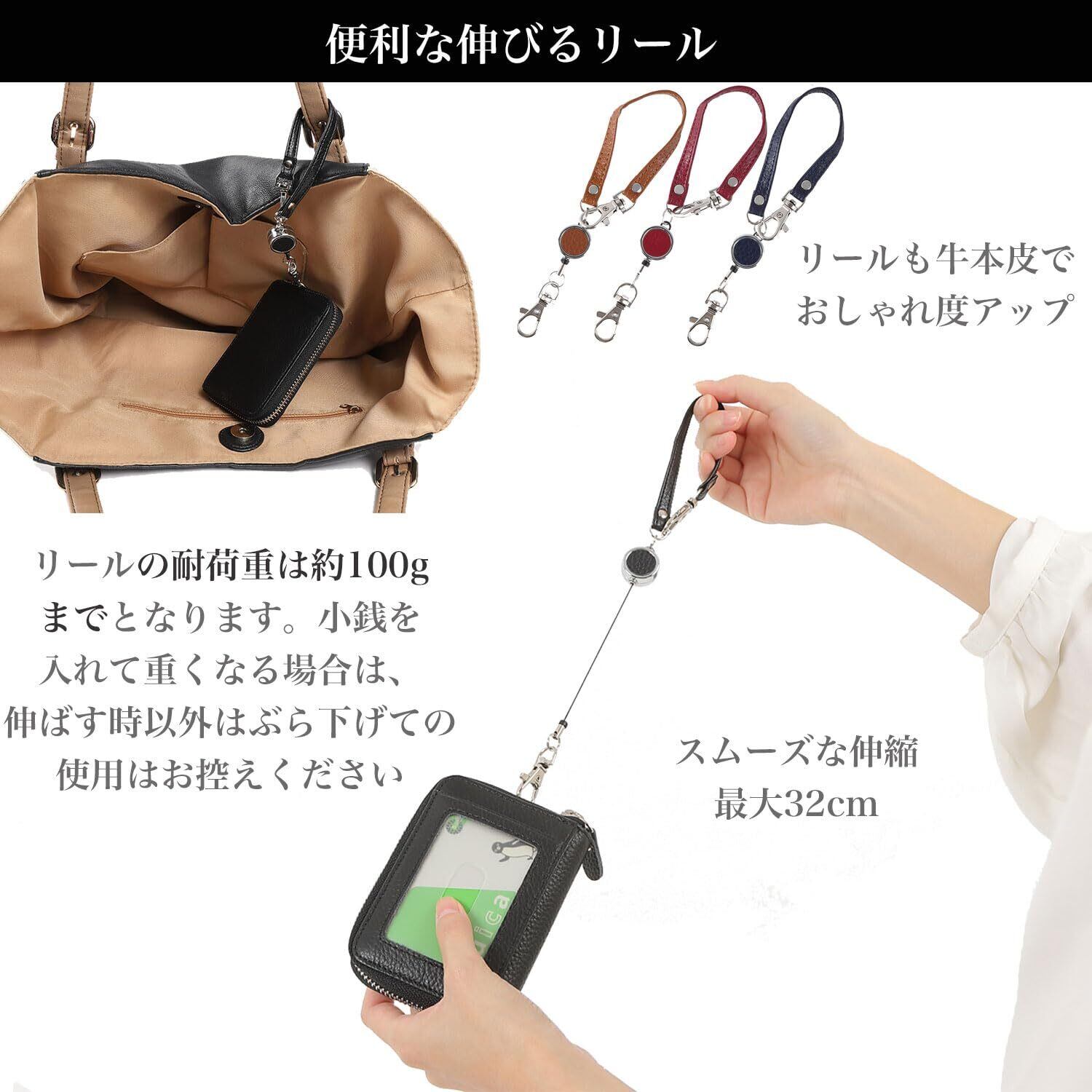 同じ牛本皮素材の伸びるリールも付属。*リールの耐荷重は約100g までとなります。小銭を 入れて重くなる場合は、 伸ばす時以外はぶら下げての使用はお控えください。