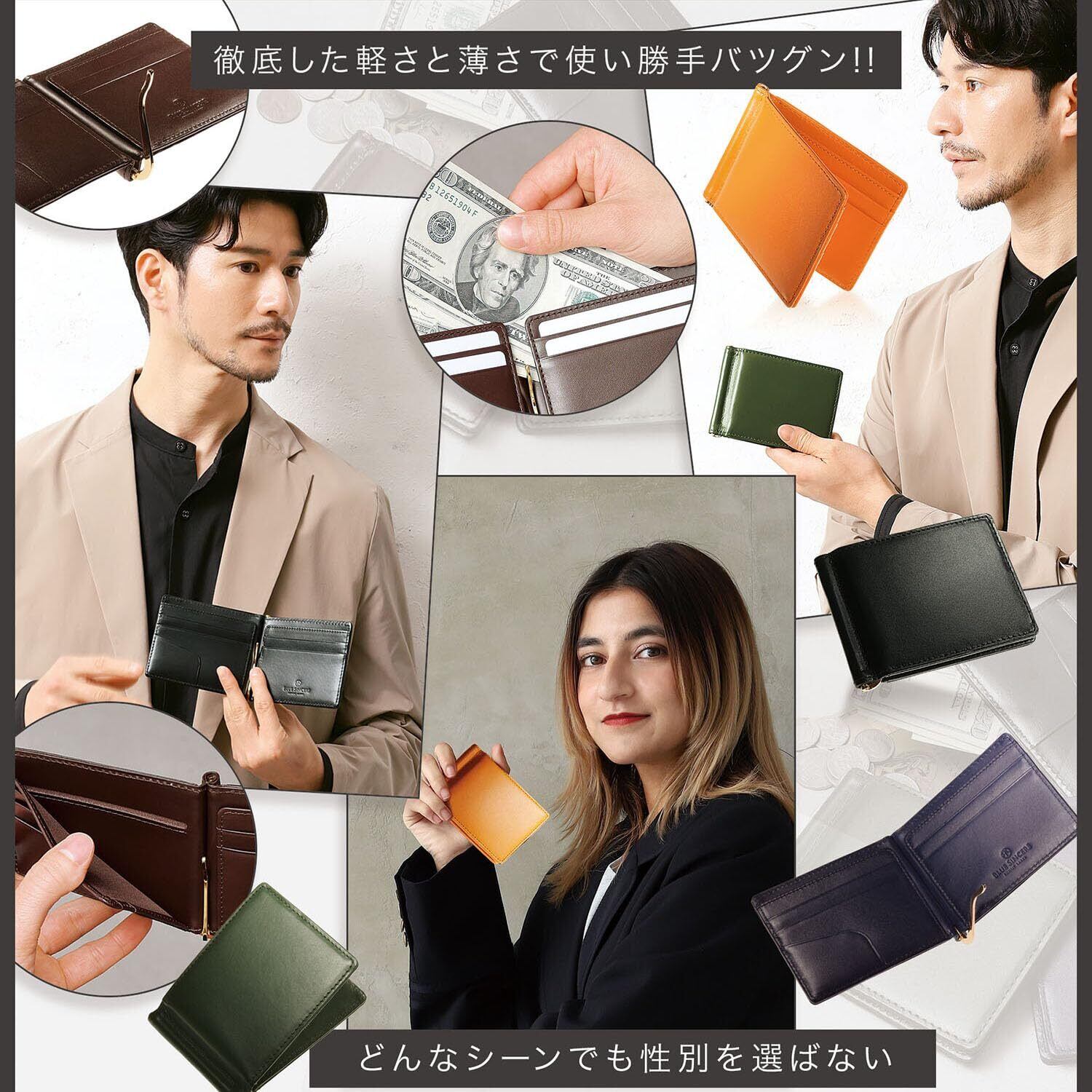 【ブルーシンシアとは?】 「ブランドの発展とともに、バングラデシュの社会問題を解決する」という理念を掲げ、 バッグや財布を自社工場のバングラデシュの職人たちと、その土地の素材の可能性を追求し、 先進国でも通用する高機能なプロダクトを生産しています。 【シンプルデザインに特化したスマートマネークリップ】カード収納は外側ICカードポケットだけでなく隠しポケットも装備した合計6ポケット。 しかも、サッと気軽にカード等を挟めるミニポケット付き。スマートなビジネスシーンや小銭を使わなくなるキャッシュレス時代にはピッタリなスマートウォレットです。