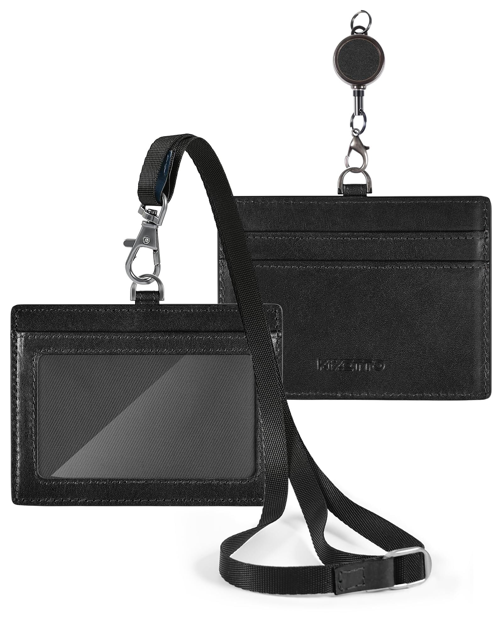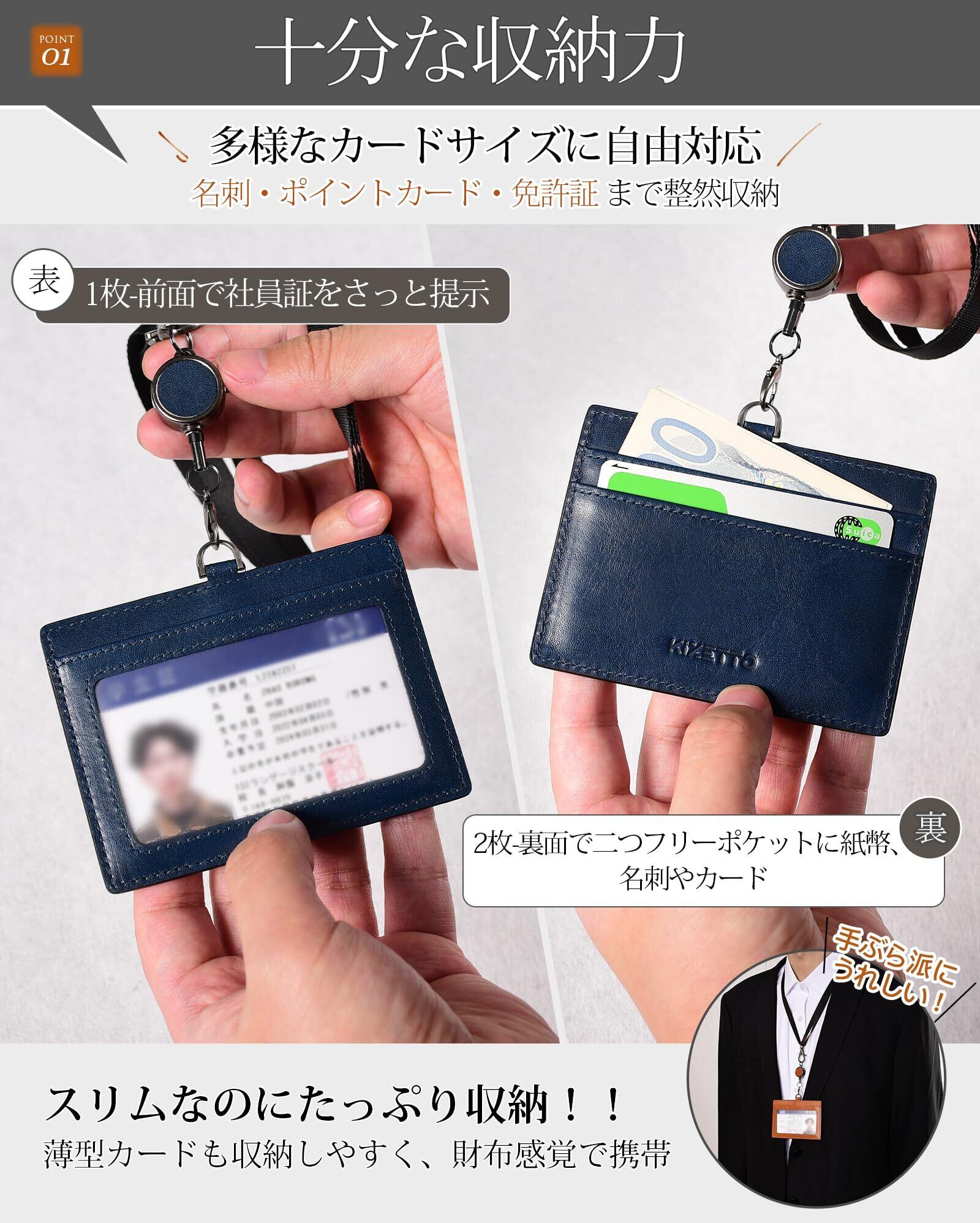 IDカードホルダー 栃木レザー 本革 社員証ケース リール付き 名札 両面収納 ネームホルダー 首掛け ネックストラップ調整可能 ビジネス 就職 社員 教師 従業員 メンズ おしゃれ (ブラック)