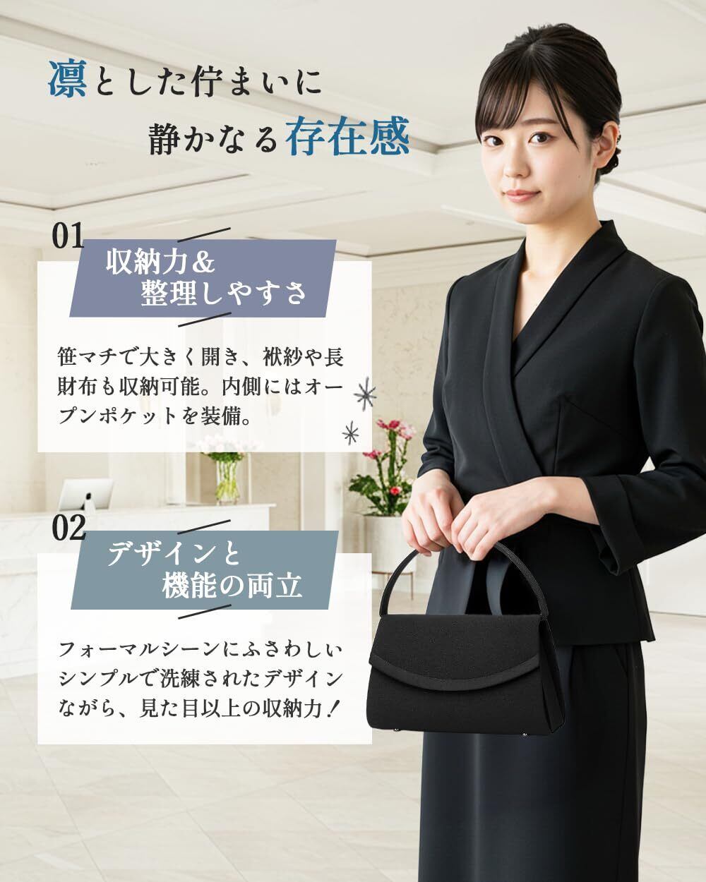 【上質素材と撥水加工で上品&安心】:上質な撥水加工を施したポリエステル素材を使用し、雨の日でも安心。しっとりとした質感と美しい光沢があり、さりげないサテンラインが高級感のある佇まいを演出します。
