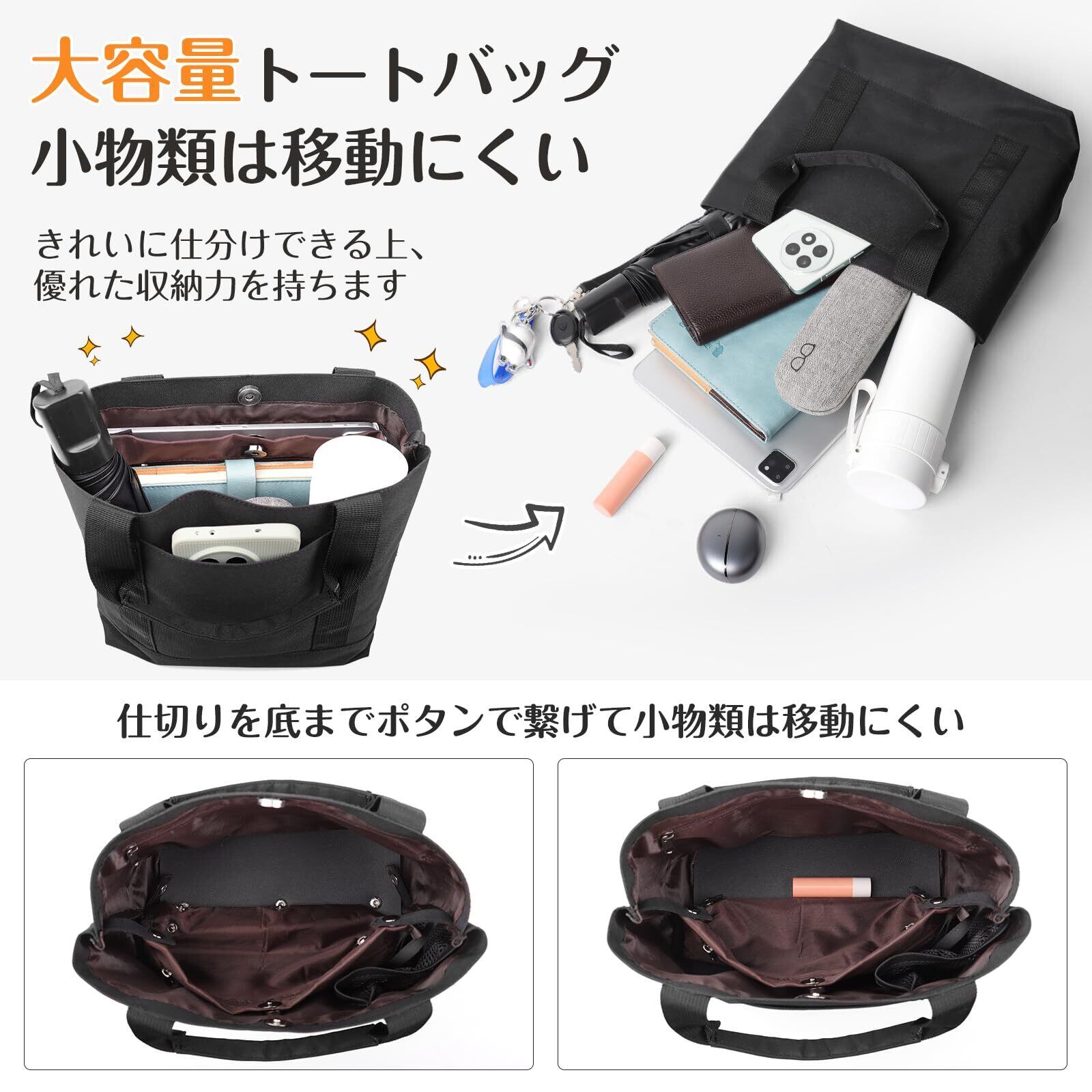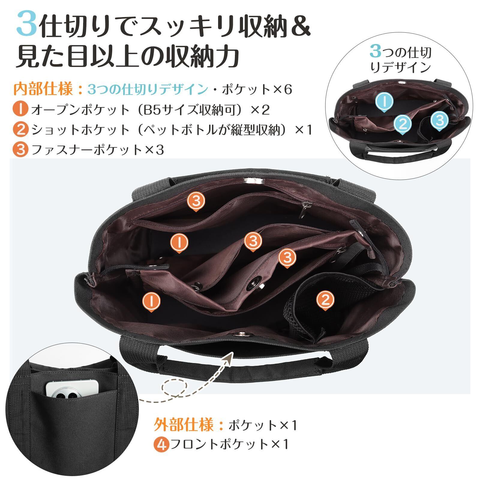 【3仕切りでスッキリ収納】ENLANトートバッグには3つの仕切りと7つのポケットがあり、荷物はサッと入れやすく、スッキリかつ楽に収納できます。荷物は綺麗に整理整頓して入れられる手提げバッグです。またペットボトルは立てて収納できてより便利に使用できます。普段使いにも、通勤バックにも使えます。