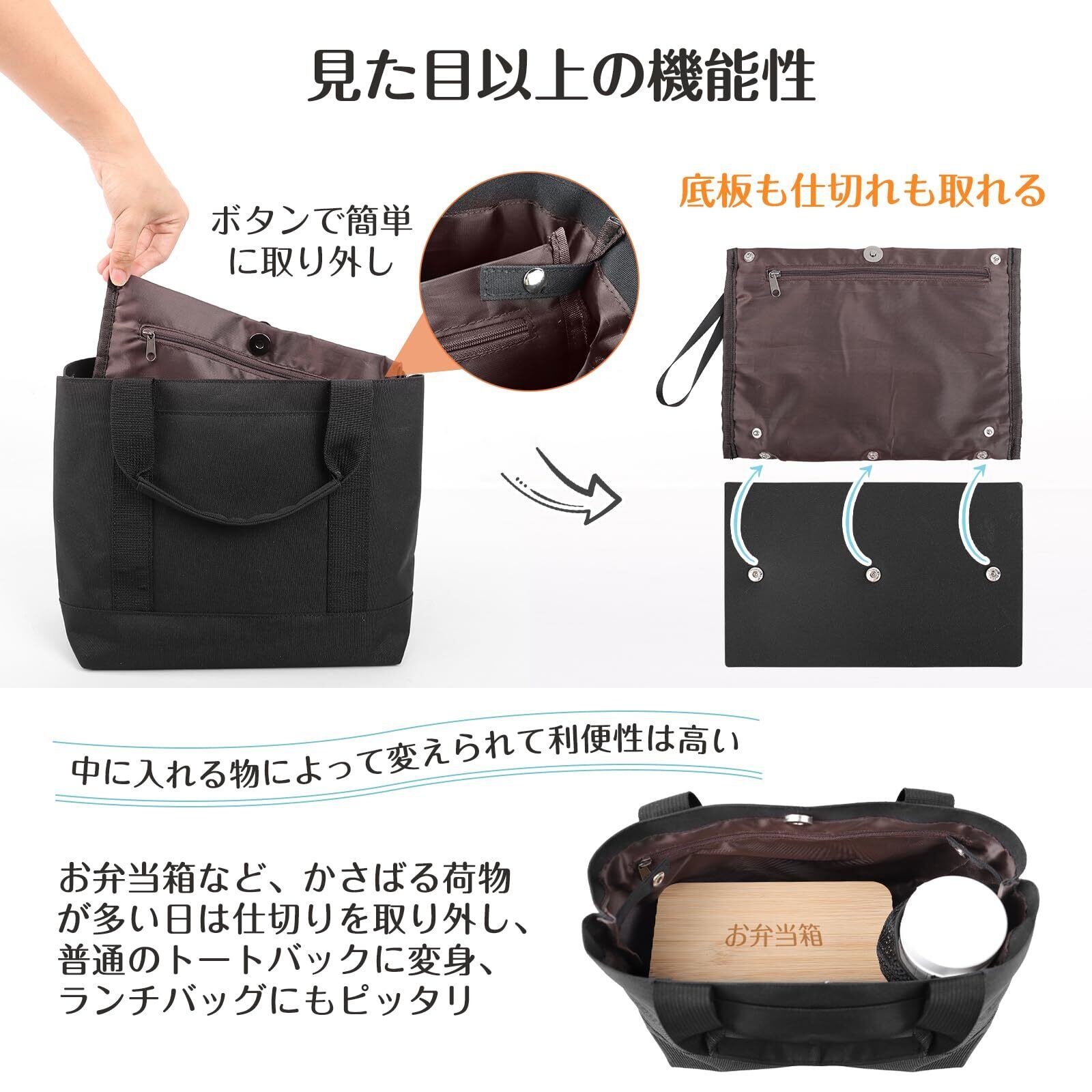 【見た目以上の収納力と機能性】コンパクトだけど収納スペースにはペットボトルが立てて収納できたり、長財布はもちろん、B5サイズノートも収納可能なレディース/メンズ トートバッグです。またお弁当箱など、かさばる荷物が多い日は仕切りを取り外して、普通のトートバッグに変身、ランチバッグにもピッタリです。さらに底板付きで多くの荷物を入れても安定して自立します。