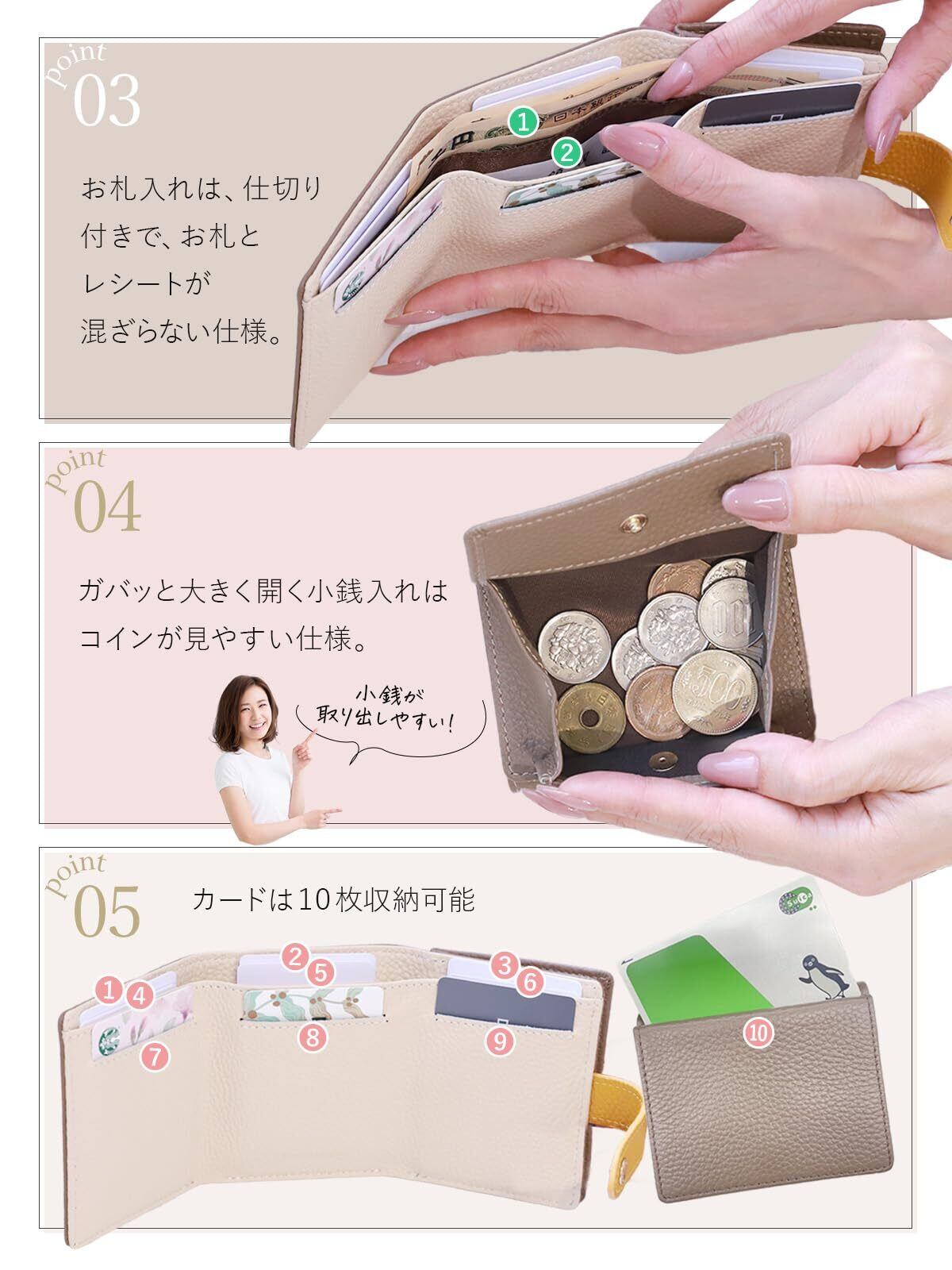 【小さいのに驚きの収納力】 カードは最大10枚収納可能で、札入れには仕切り付き。おしゃれなバイカラーフラップも魅力です。