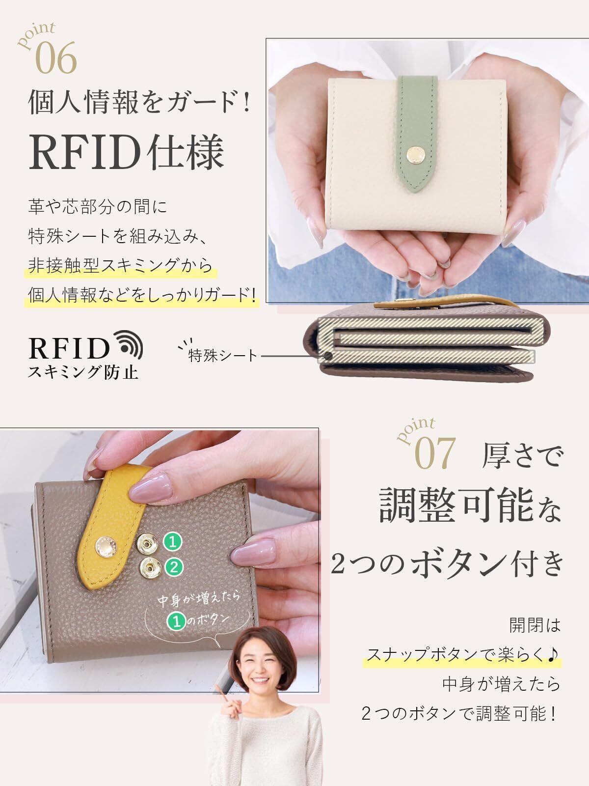 【スキミング防止で安心】 RFIDブロック素材を内蔵し、クレジットカードなどの個人情報をスキミングからしっかり保護。海外旅行や日常使いでも安心してご利用いただけます。