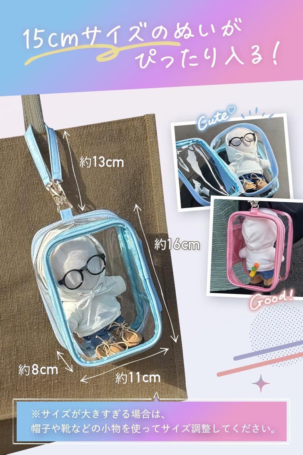 ✨【360°推しが見える!】推しは後ろ姿までかわいい。そんなこだわりの推しの姿は隠したくない!推しの背中までしっかり見えるように、Mowekのぬいぐるみポーチは前面も背面も透明PVC素材を使用。推しをクリアに際立たせます。