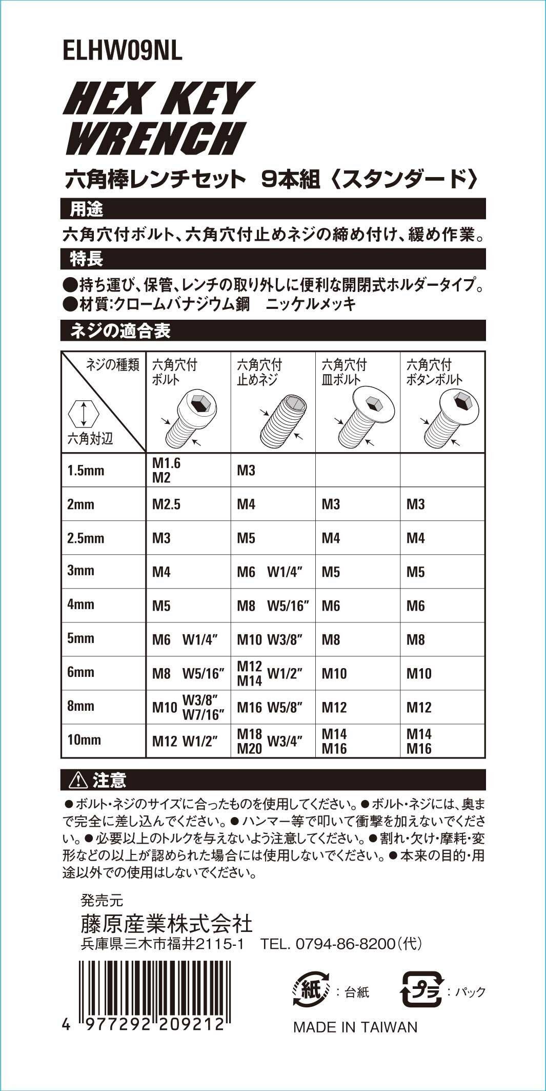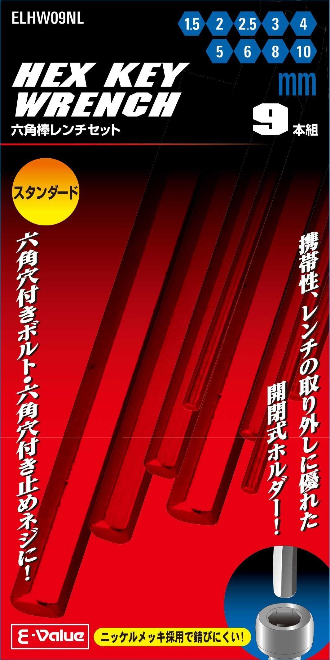イーバリュー(E-Value) 六角棒レンチセット ミリ 1.5・2・2.5・3・4・5・6・8・10mm 9本組 ELHW09NL