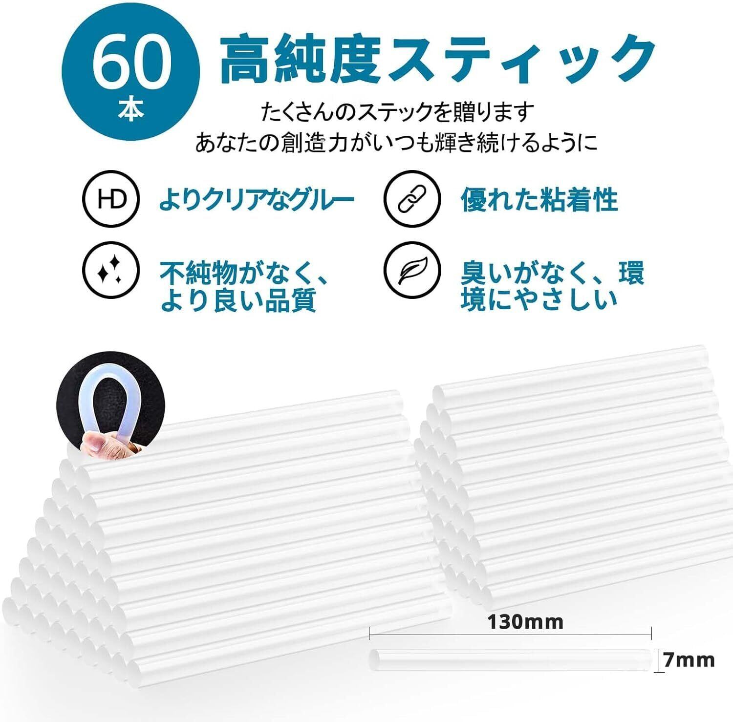 【大容量60本スティック & コード式で電源切れなし】 コード付き設計のため、充電待ちがなく、コンセントがあれば長時間の連続作業が可能。付属のグルースティック60本(7mm×130mm)は無臭・透明で、様々な素材に万能に使える強力接着剤です。
