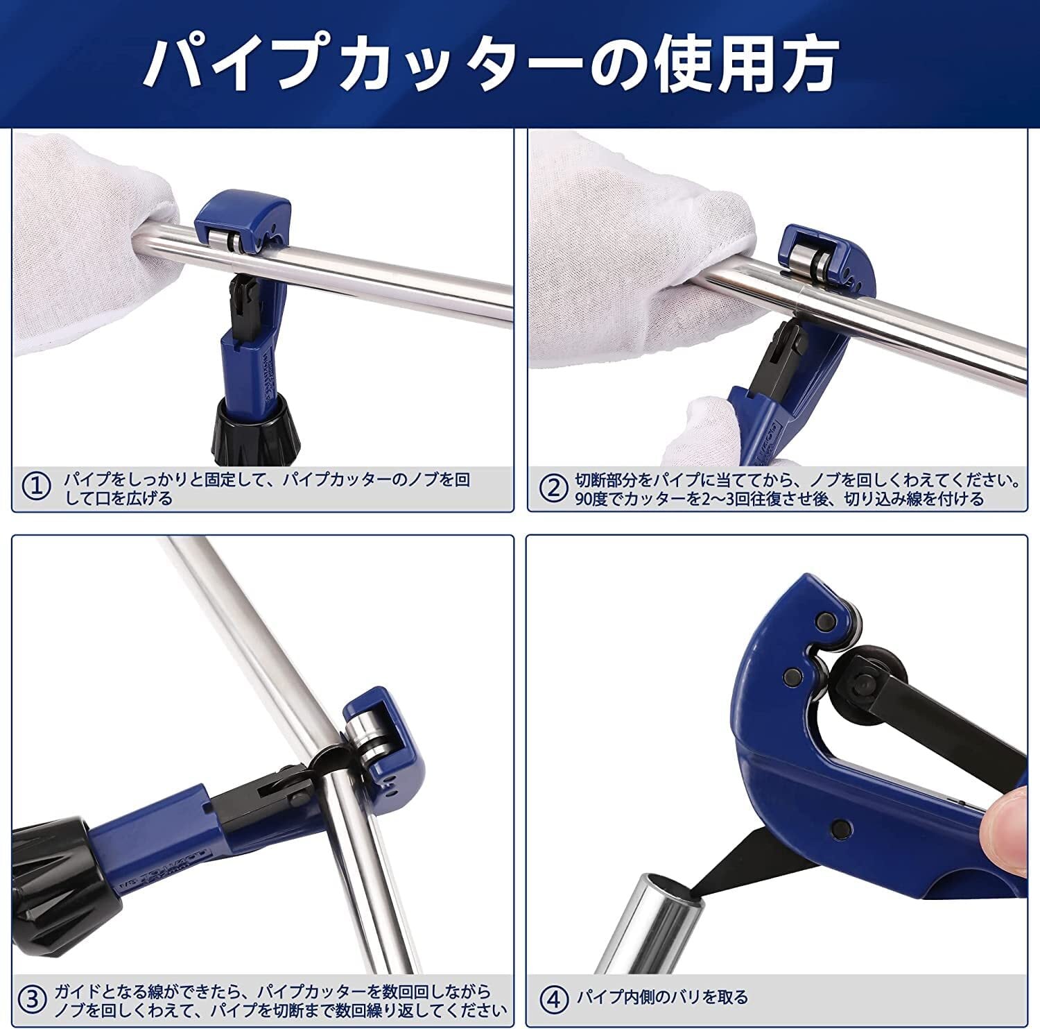 【使用方法】ローラーベアリング設計なので、ローラーとカッター刃の距離はノブを回すにより、調節しますので、作業の中に、切り込みが深くなると、ノブを回してローラーとカッター刃で対象物のパイプをしっかり挟んで回転させます。使用中に、カッター刃と対象物に当たる角度が90度であることを確認してください、斜めになる場合、スムーズに切断することができません。