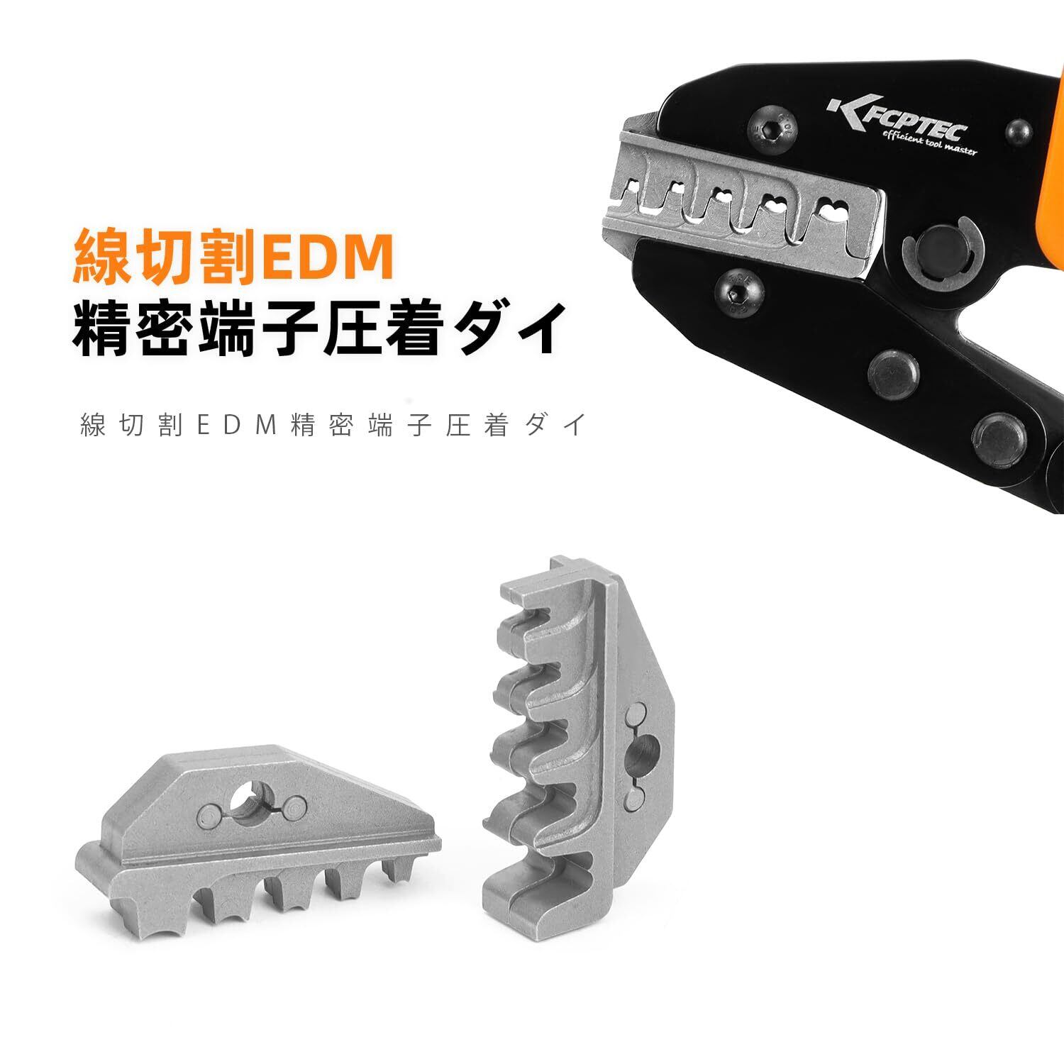 【高精度な圧着ダイとEDM線切り加工】クロムモリブデン鋼製の圧着ダイは、EDM(ワイヤーカット放電加工)によって成形され、切断面の寸法精度が非常に高く、長期間の使用でも精度を維持します。高強度合金素材により耐摩耗性・耐久性にも優れています。