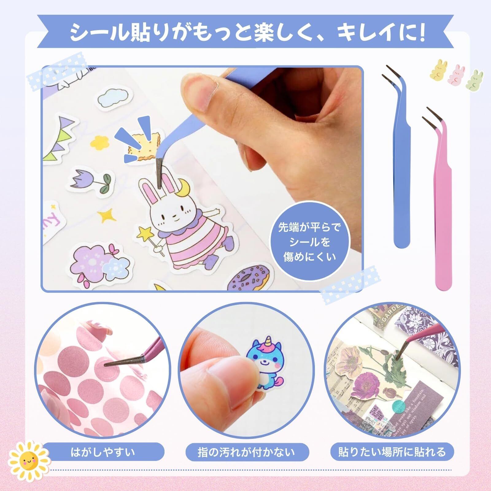 小さなシールも扱いやすい、キャップ付きのシール専用ピンセットです。先端はシールをすくいやすく、粘着面やデザインを傷つけにくい先丸フラットヘッド形状を採用。極小シールや薄手のステッカーでもズレにくく、指で触れずにきれいに貼り付けられます。 さらに、細かい作業がしやすいカーブ型設計で、手元が見やすく繊細な位置調整もスムーズ。手帳デコ、推し活、ネイルアート、クラフト作業など幅広いシーンで活躍します。 使用後はキャップを付けて保管できるため、先端の保護や持ち運びにも安心。上品でかわいらしいパープルカラーは、文房具やデコアイテムとの相性も良く、作業時間をより楽しいひとときにしてくれます。