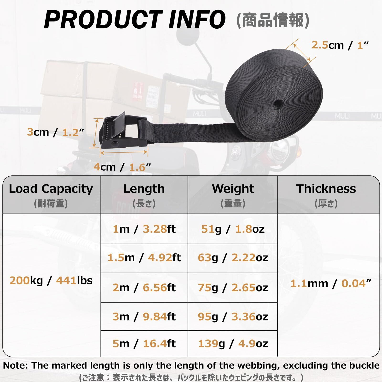 【寸法】ラッシングベルト幅2.5cm;長さ2m、3m、5m; 厚み: 1.1mm; 破断荷重: 200kg