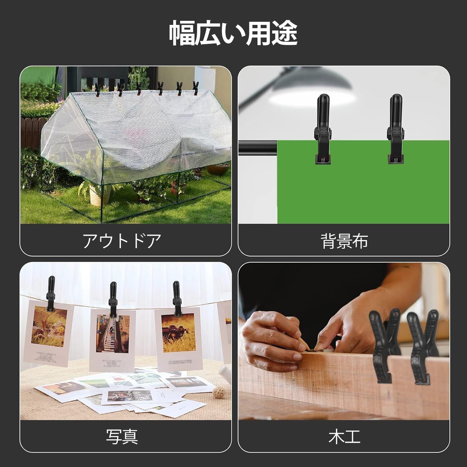 【上質な素材&幅広く用途】高品質なナイロンと金属素材が採用されて、強力だけでなく耐久性にも優れています。スプリングクランプは用途が広く、軽量で使いやすく、一般クラフト、大工道具、モデル作り、ホビー、木工作業、撮影、物干し等の固定作業にも応用できます。
