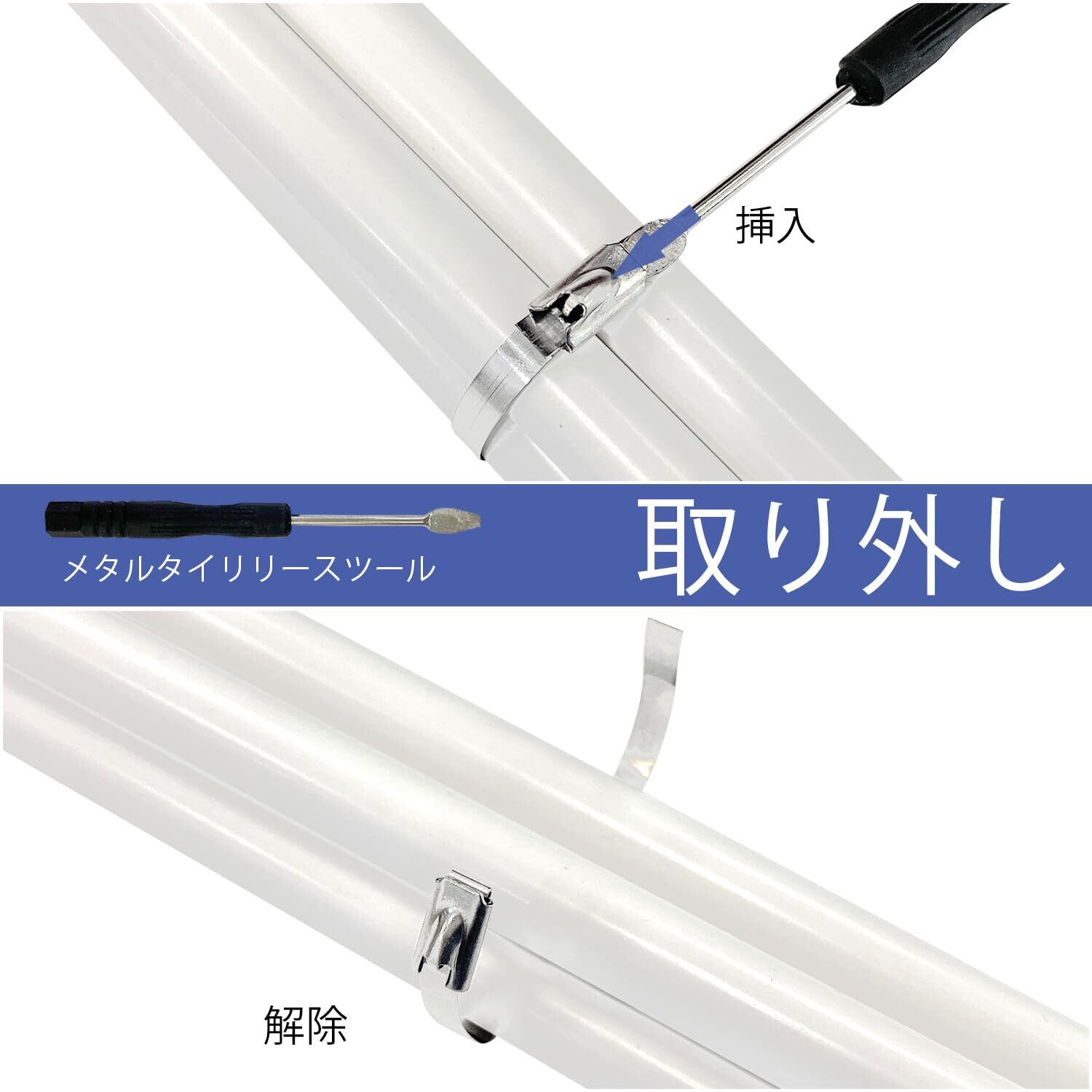 【基本仕様】素材:メタル、炭素鋼;適応メタルタイ:最大幅12mm;最大厚さ0.3mm;重量:520g;セット内容:ステンレス結束バンド4.6*300mm(100本入り)