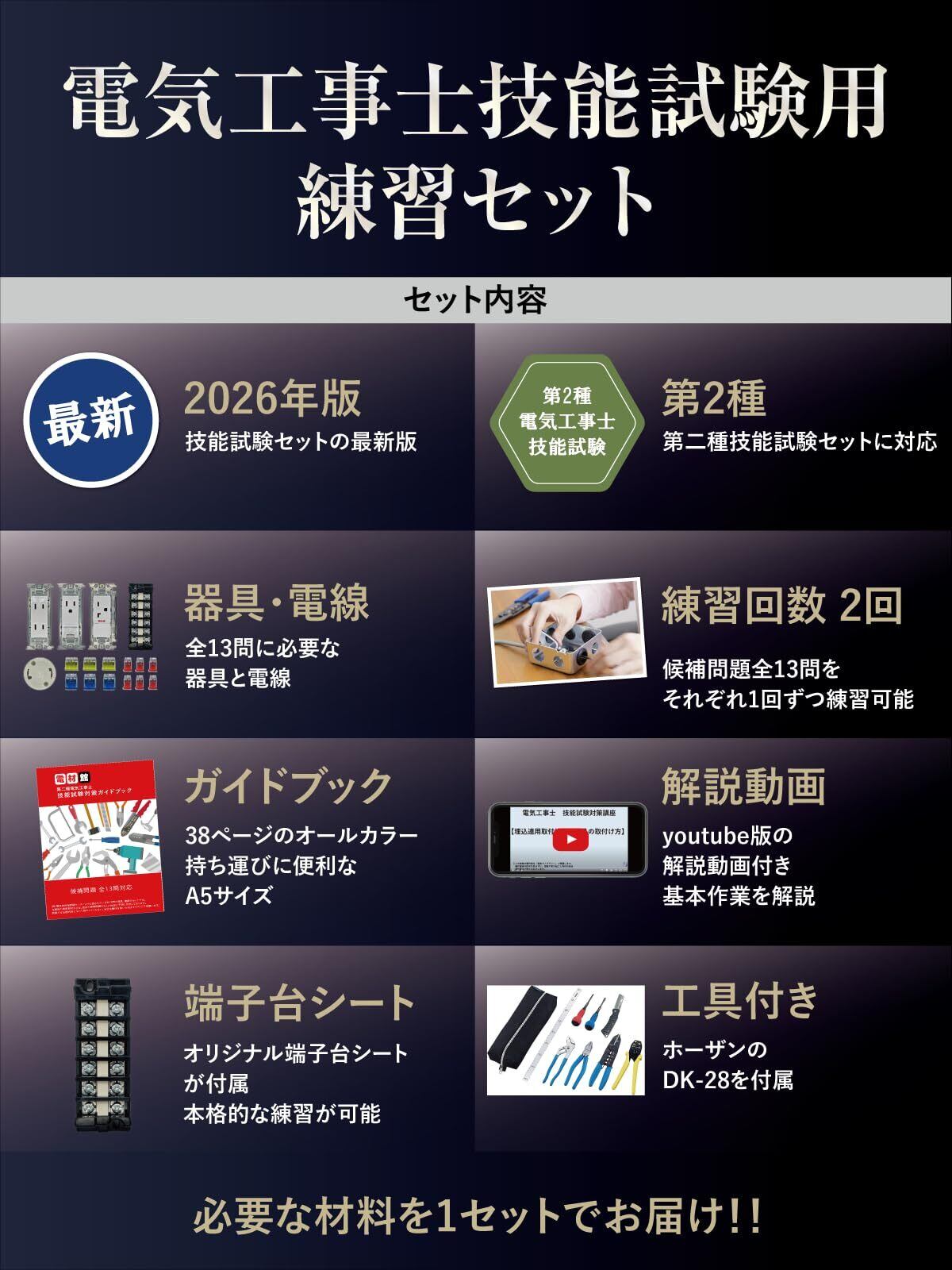 電気工事士 2種 技能試験セット 2026年 【技能試験を完全攻略】 電線2回分・ホーザン工具 電材館 全13問の器具と電線