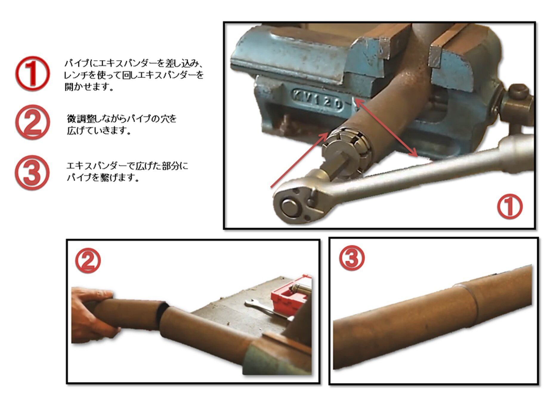 広げたいパイプにエキスパンダーを差し込み、あとはレンチを回していくだけで、 エキスパンダー本体が徐々に広がっていき、簡単綺麗にパイプ径を広げてくれます!