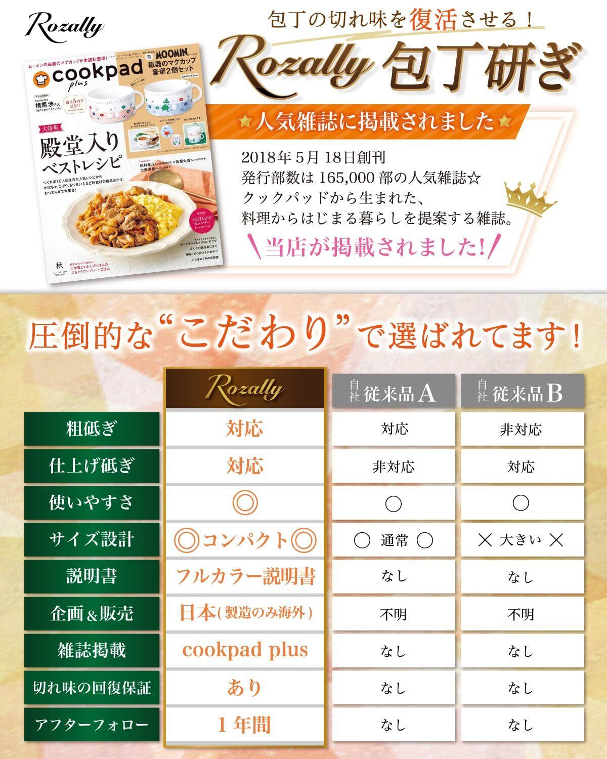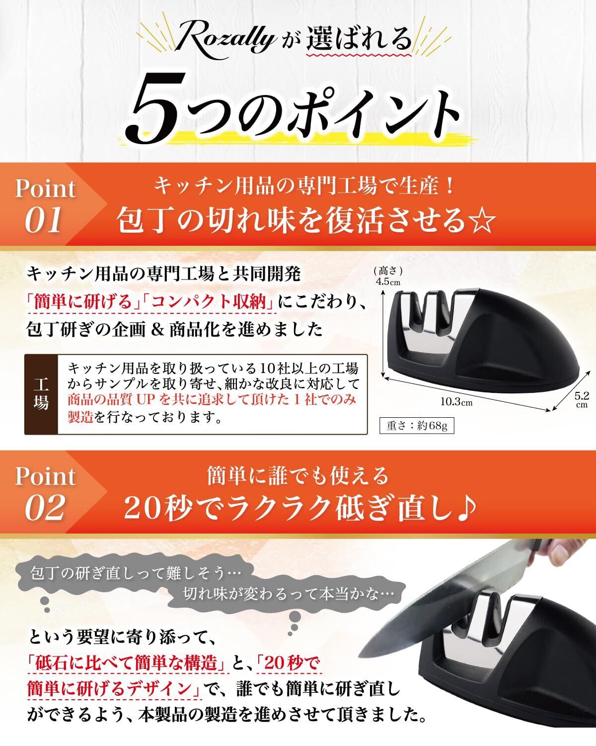 【こだわり】 様々なから キッチン 用品として ” 包丁砥ぎ器 (包丁研ぎ機) ”や” 包丁用シャープナー ”など 日本製/中国製など様々に販売されていますが、 Rozallyの 包丁シャープナー は”こだわり”が一味違います。 「軽量&コンパクト設計」で場所を取らず、 「簡単にスライドするだけ」で切れ味を回復させることができます。