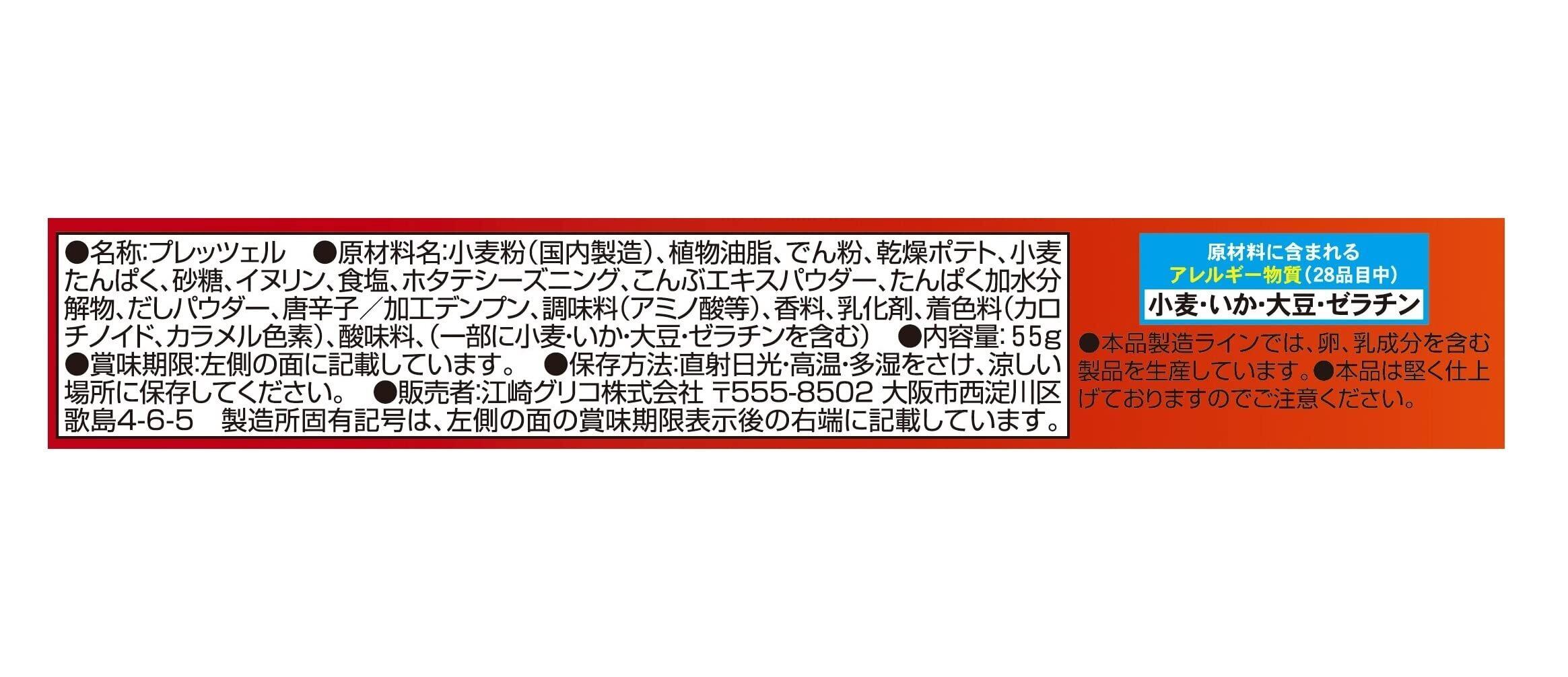 小麦粉(国内製造)、植物油脂、でん粉、乾燥ポテト、小麦たんぱく、砂糖、イヌリン、食塩、ホタテシーズニング、こんぶエキスパウダー、たんぱく加水分解物、だしパウダー、唐辛子/加工デンプン、調味料(アミノ酸等)、香料、乳化剤、着色料(カロチノイド、カラメル色素)、酸味料、(一部に小麦・いか・大豆・ゼラチンを含む)