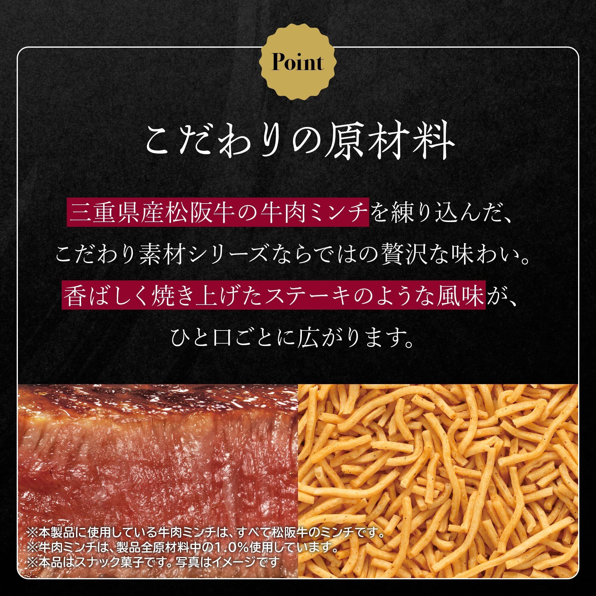 【松阪牛の旨みと重厚な味わい広がるステーキ味】 『ベビースターこだわり素材(松阪牛ステーキ味)』は、三重県産松阪牛の牛肉ミンチを生地に練り込み、松阪牛の旨みと重厚な味わいの松阪牛ステーキ味に仕上げました。おやつカンパニーが伝統の製法で作り上げた、ベビースターならではの香ばしさと、食べ応えのある味わいをご堪能ください。