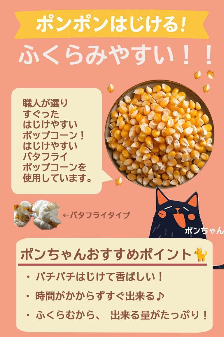 はじけやすい!厳選バタフライタイプ バタフライタイプのコーンは、ふんわりと大きくはじけて軽い食感が魅力。ポンポンとよくはじけて、失敗が少なく、初めての方にもぴったり!フライパンでもレンジでも、おいしく簡単に仕上がります。