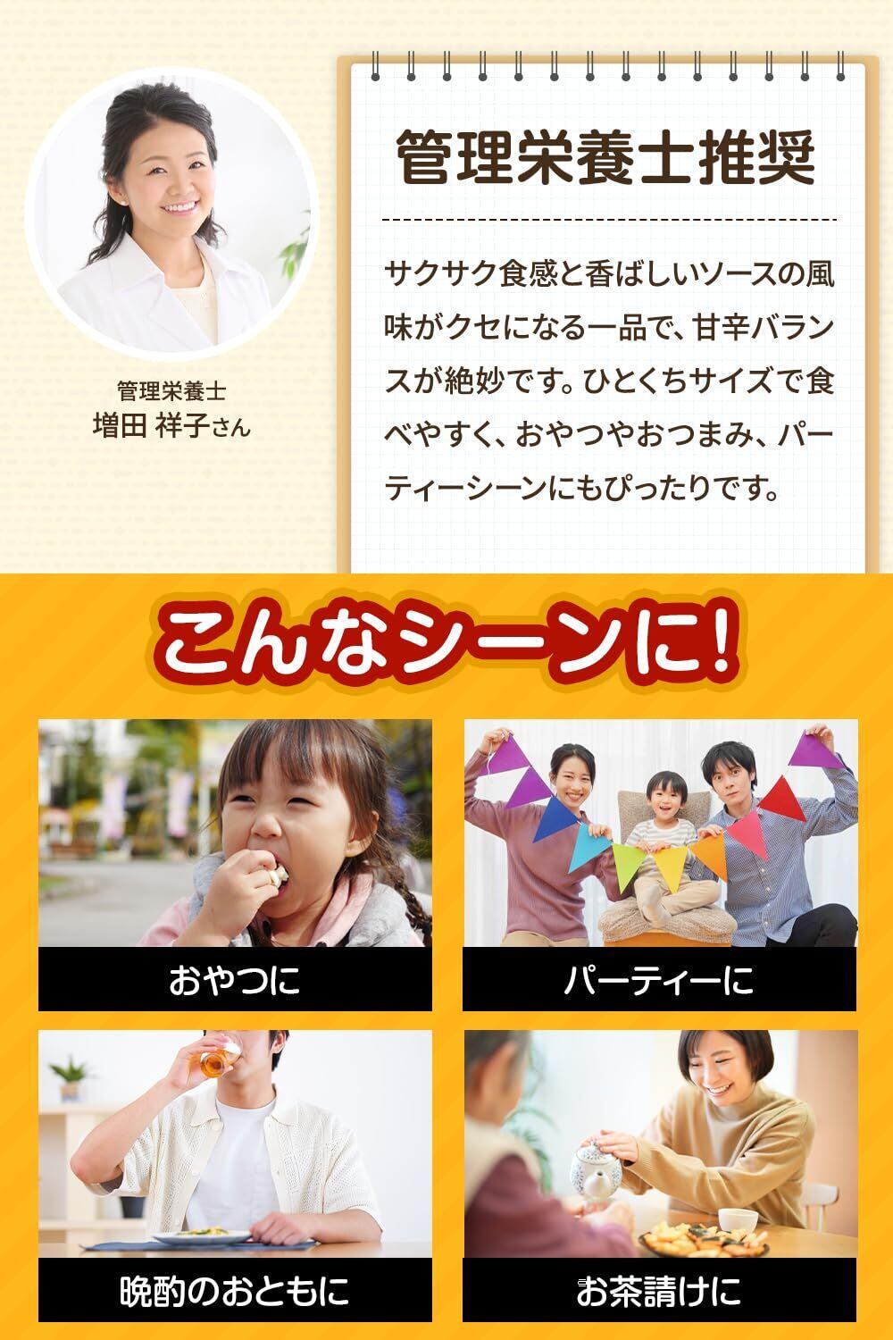 【管理栄養士推奨】サクサク食感と香ばしいソースの風味がクセになる一品で、甘辛バランスが絶妙です。ひとくちサイズで食べやすく、おつまみやお菓子、パーティーシーンにもぴったりです。