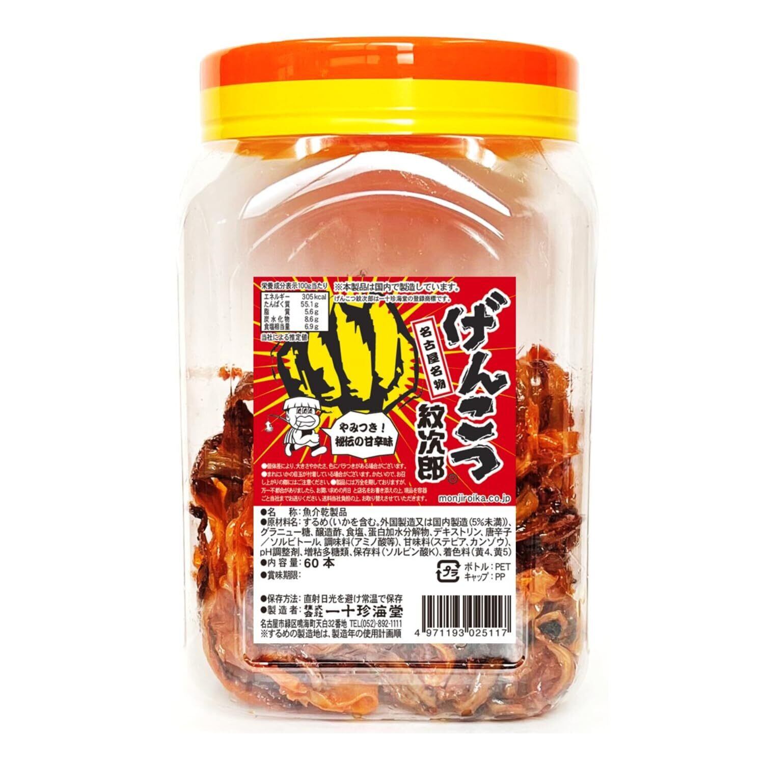 かむほど味があるで! ! 名古屋名物 げんこつ紋次郎です。1つの容器に甘辛く煮付けたイカの駄菓子が60本入っております。皆様は昔本品をよく駄菓子屋さんに小銭を持って買われたのではないでしょうか。今となっては駄菓子屋さんも少なくなっておりますが、今も昔も変わらぬ味わいを継承し続けている「一十珍海堂」の商品です。ご家庭や職場に一箱置いておくだけできっといつの間にかなくなってしまうそんな商品だと私たちは考えております
