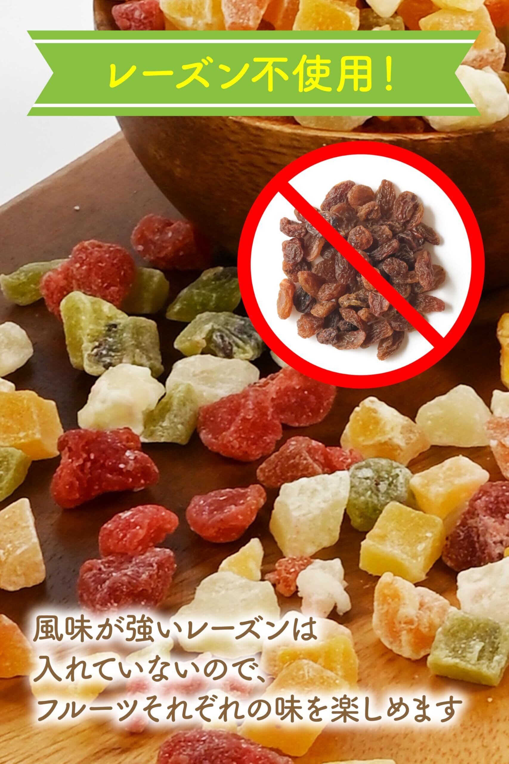 【レーズン不使用でバランスの良い味わい】 一般的なドライフルーツミックスに多く含まれるレーズンをあえて使用せず、各フルーツの味わいが均等に感じられるよう工夫しています。これにより、トロピカルフルーツの豊かな風味をお楽しみいただけます。