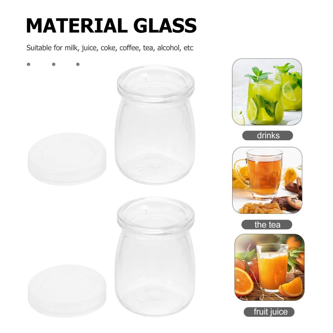 耐久性のあるガラス素材と密閉可能な蓋付き:本製品は上質なガラスで製造されており、長期間の使用に適しています。蓋付きデザインによりプリンやジュースの鮮度を保ち、持ち運びや保存時のこぼれを防止します。